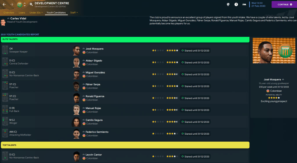 Lazaró had been promised a first “poor” youth intake, with the forecast being one A-rated midfielder. But when it arrived, he got another good one containing three 5-star, four 4.5-star and two 4-star potential players. The star graduate was goalkeeper José Mosquera, but Lazaró was more excited about striker Fáiner Serpa. Other possible talents include centre-backs Aldayr Silgado, Miguel González and Leyvin Cantor, right-back Manuel Rojas, midfielder Federico Sarmiento and striker Ronald Figueroa.