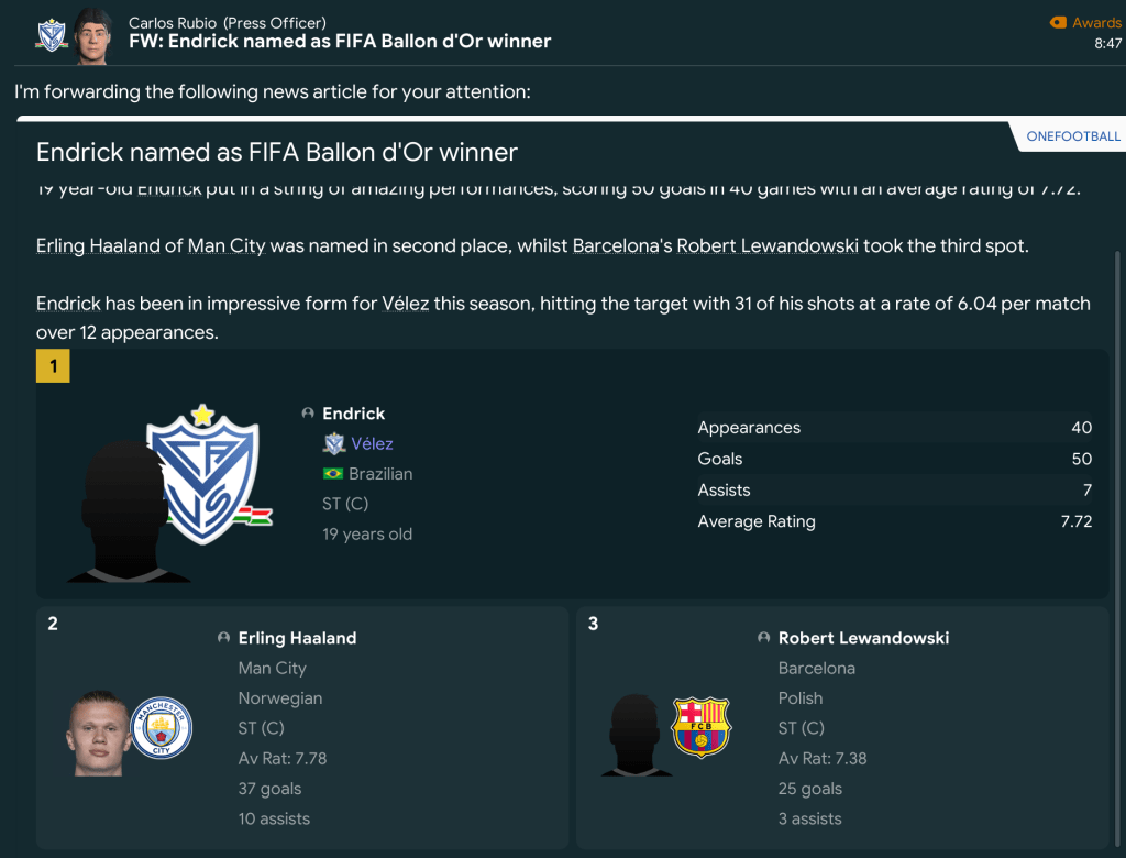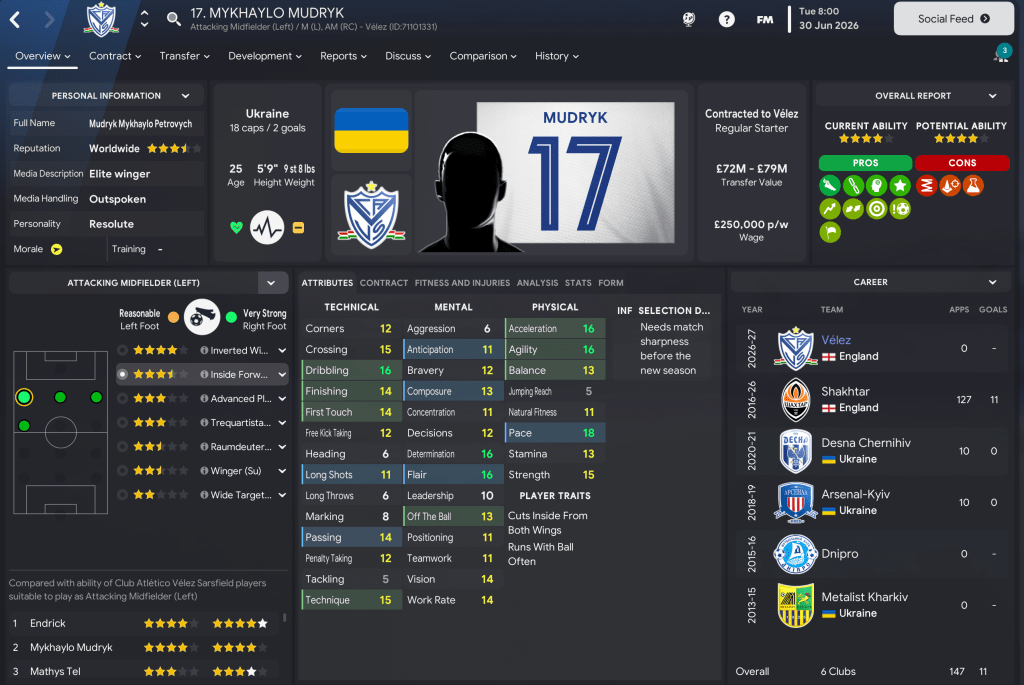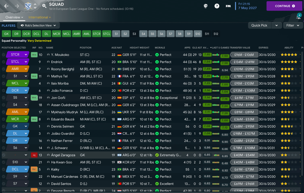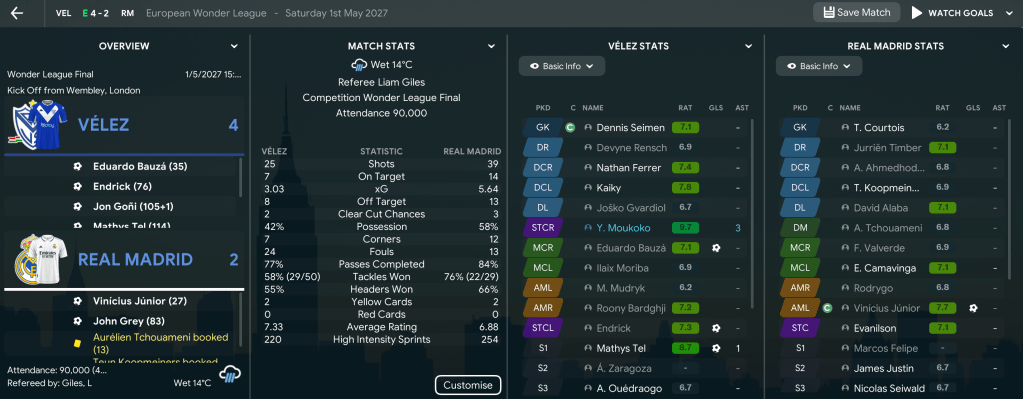 We wrapped up a treble this season, confirming Vélez as one of the best teams in the world. Endrick again finished the campaign as our top scorer with 46 goals and 8 assists in 47 games. But our best player was probably Moukoko, who scored 29 and got 13 assists with a 7.65 average rating compared to Endrick’s 7.54. Bardghji also impressed with 19 goals and a club-high 20 assists, Tel scored 18 and got 12 assists, Mudryk got 8 goals and 16 assists and Bauzá scored 8 and got 7 assists.