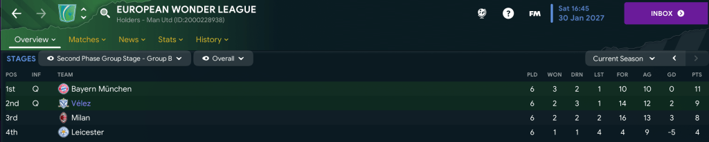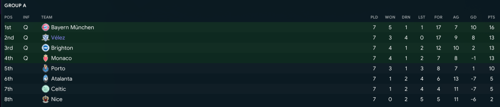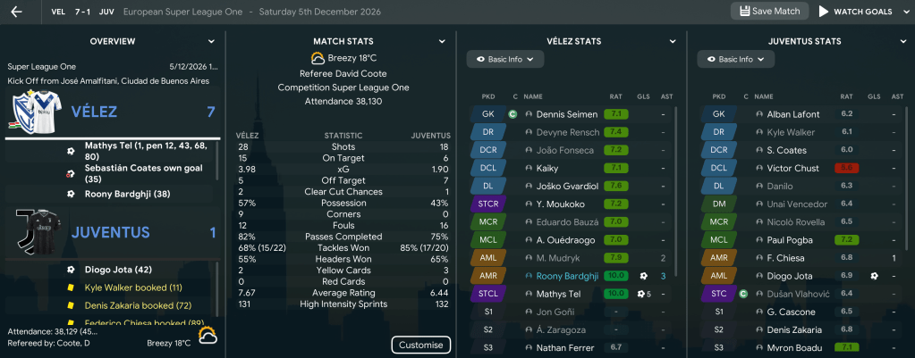 We again began at home to Flamengo and Endrick and Moukoko goals sealed a 2-0 win. We won 3-1 at Roma and Moukoko nicked a 1-0 at home to Atlético. Then an Endrick double and Bauzá’s injury-time winner nicked a 3-2 at Juventus to send us top of the league for the first time. We kept that going as Endrick and Moukoko scored in a 2-1 win at home to Leeds before finally dropping points at the 7th attempt with a 1-1 at West Ham. However, we responded in the best way possible by going to leaders Real Madrid, who’d won 7 out of 7, and nicking a totally undeserved 2-1 win through Moukoko and Endrick.