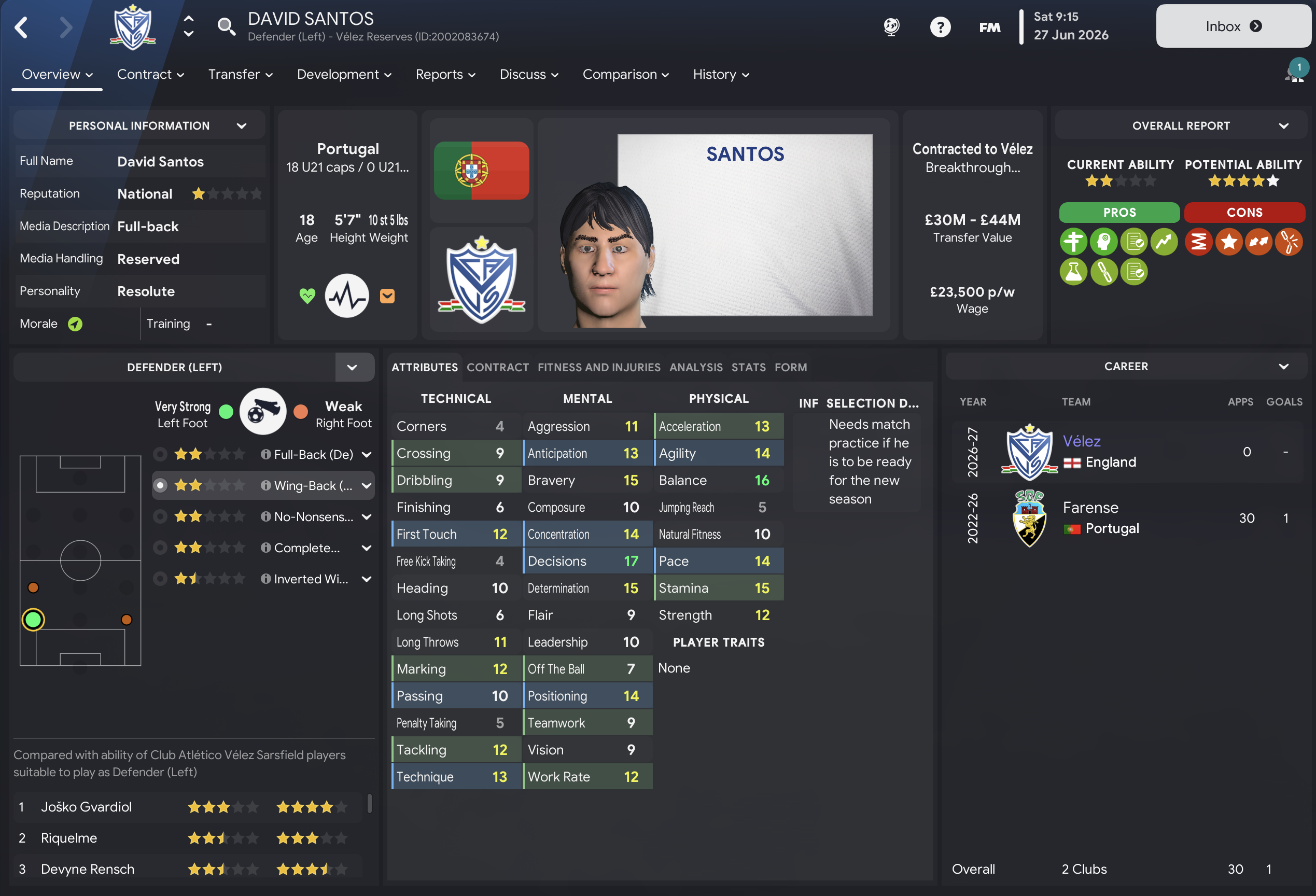 The key area of the pitch we needed to address was strength in depth on the wings, which I addressed by signing the pacey Mykhaylo Mudryk for £46m from Shakhtar. We also snapped up a couple of exciting youngsters in left-back David Santos, who signed for £34.5m from Farense, and Mexican midfielder Manuel Cárdenas, who came in for £22m from Real Madrid. We then splurged £55m on versatile Bayern midfielder Johannes Schwarz, who looks like a ridiculous player.