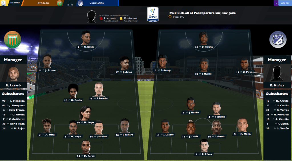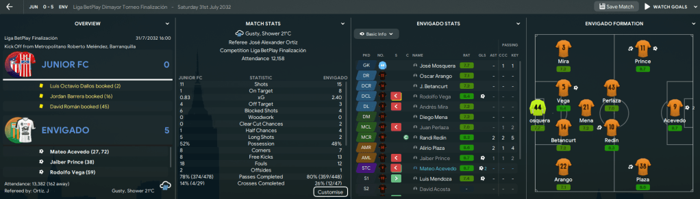 They began away to Santander and Acevedo smashed the goalscoring record with a hat-trick inside 38 minutes to lead a 5-1 thumping. Three days later, they travelled to Orsomarso and a heavily rotated side drew 3-3 with goals by Mendoza, winger Cristian Gutiérrez and Acevedo’s late equaliser. Two days later, the teams met again and Envigado won 3-0 with two Aria assists.