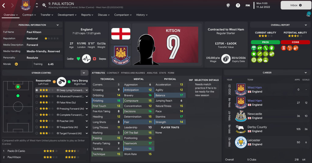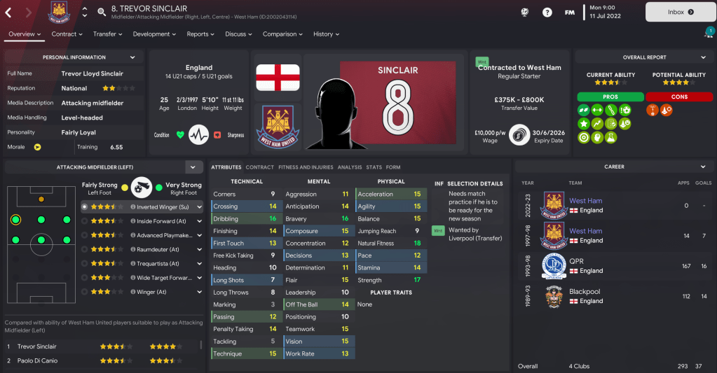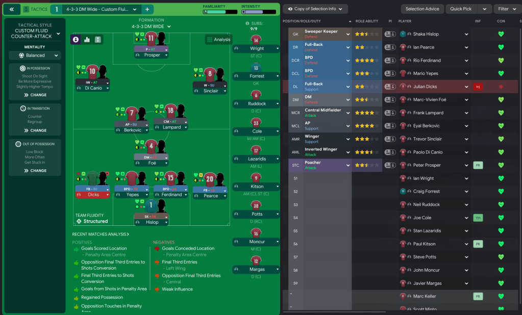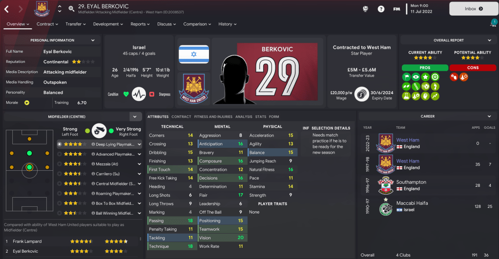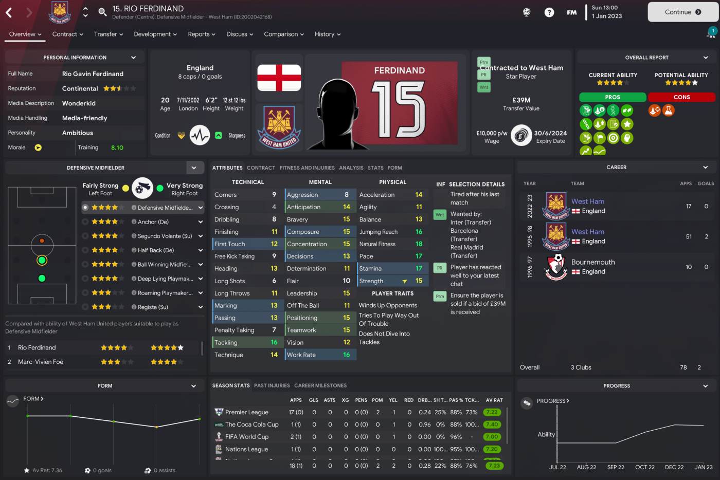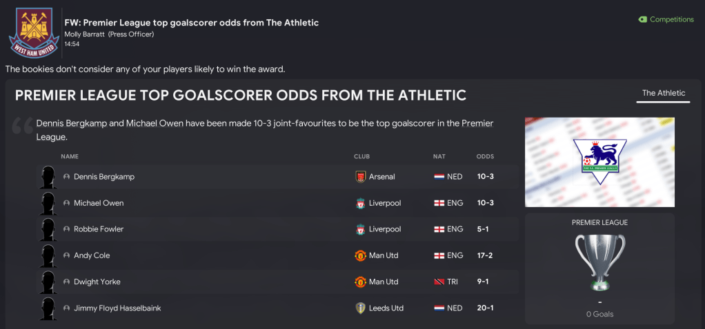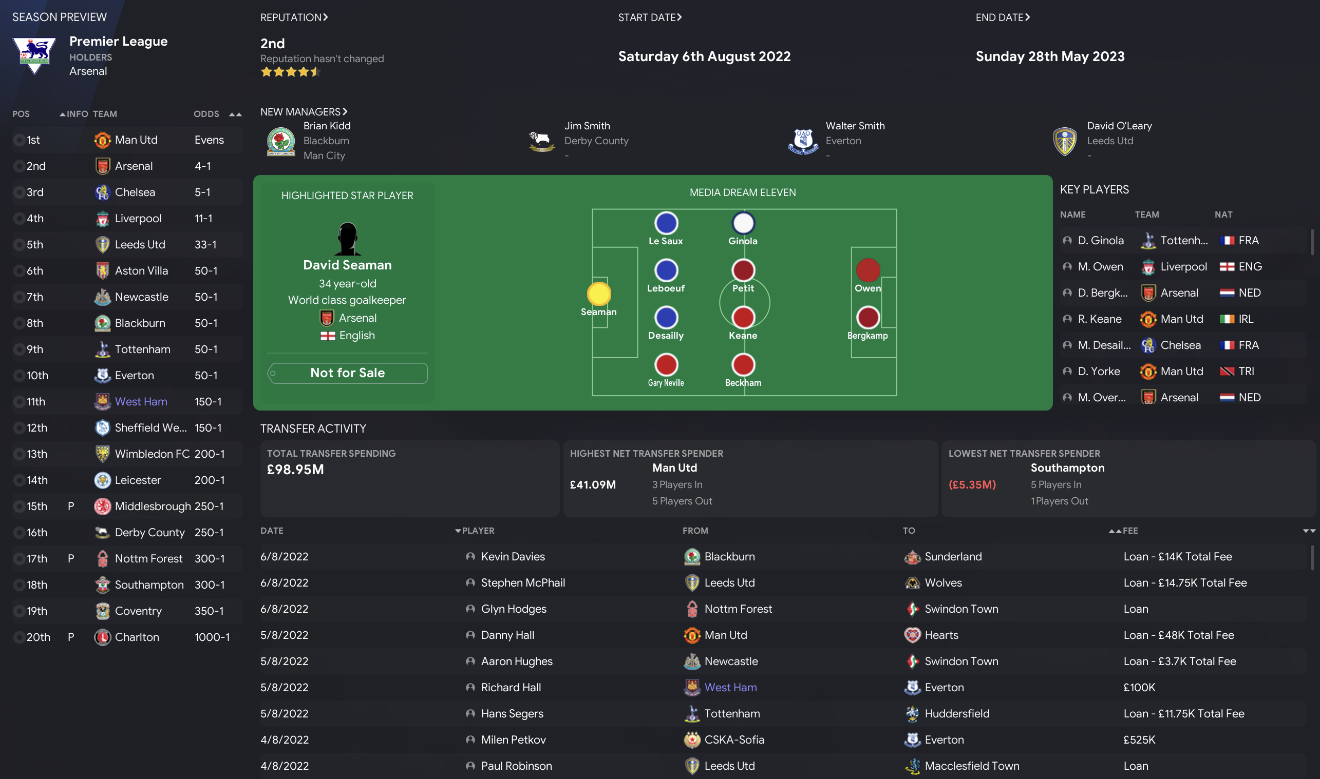 West Ham are fancied to finish firmly in mid-table. And to give you an idea of some of the top players in the Premier League and the makeup of the league in general, here are the key players considered for the top awards. Yep, David Ginola is a God on FM, apparently.