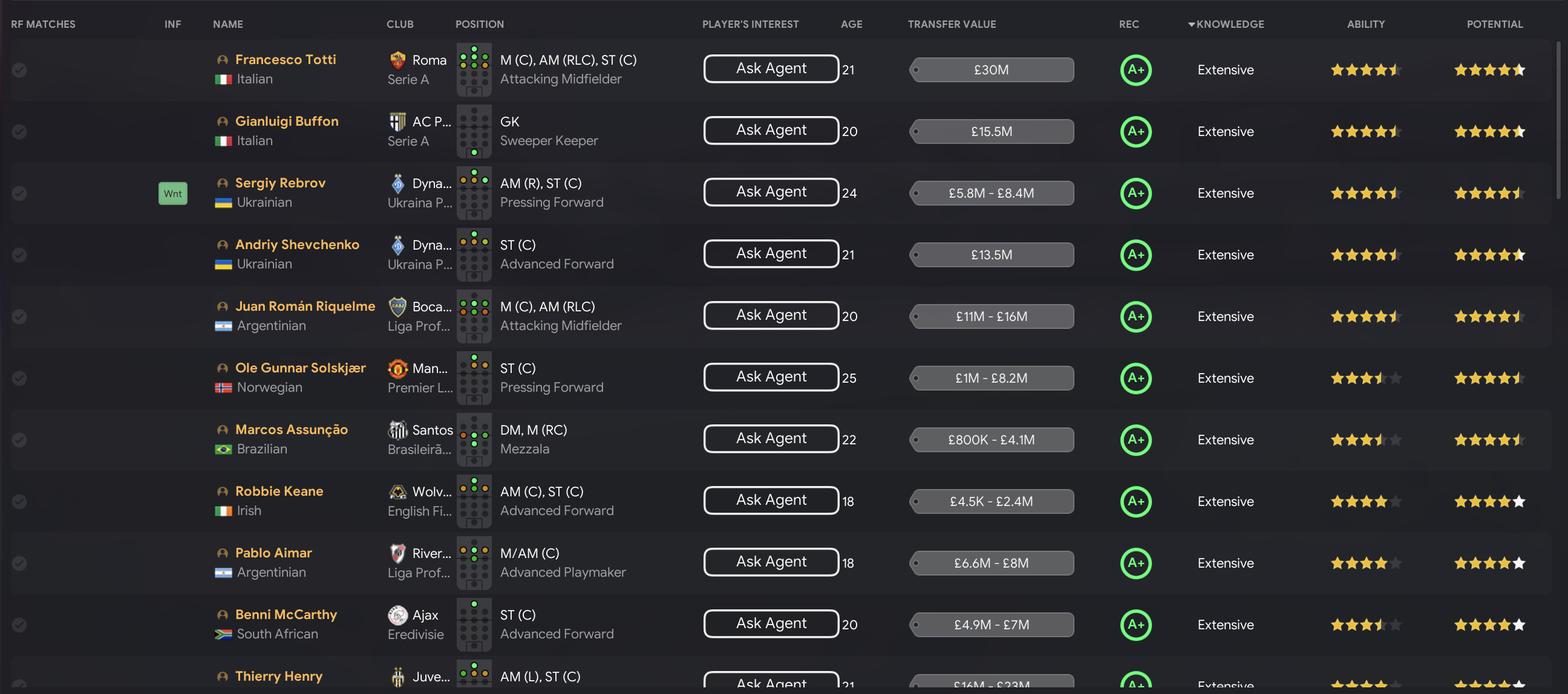 Mahtal’s first move? Bringing in Diego Maradona on trial! But he was considered to be awful by the coaches despite some impressive technical and mental stats. So with Maradona departing the club, we targeted bargains starting with 6ft 5in Trinidadian striker Peter Prosper (who was amazing on the original game) for £500k, solid centre-back Mario Yepes for £750k and a certain Miroslav Klose for £50k, then loaned him back to Homburg. And that’s where the business finished as there was no more money available! But the lengthy shortlist looks pretty impressive and fairly ambitious…