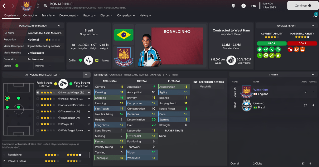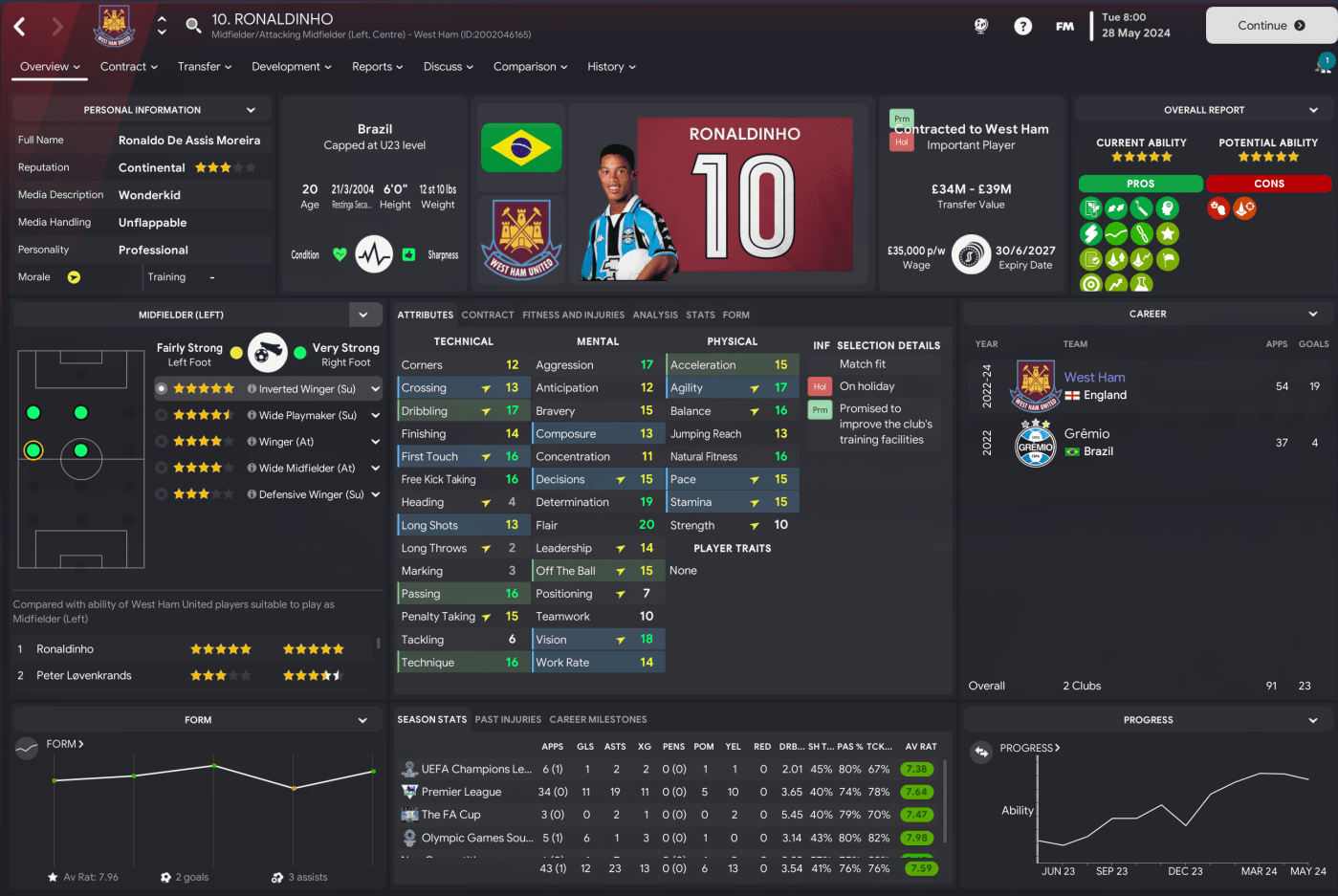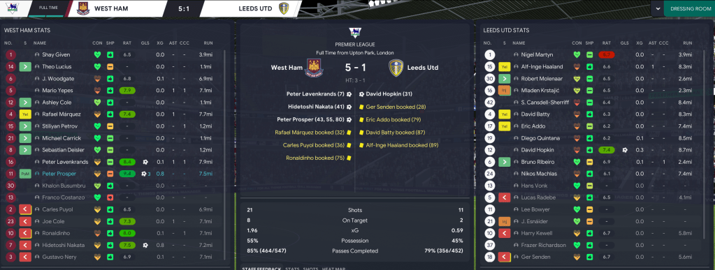 Prosper was West Ham’s top scorer with 21 in 43 followed by Lampard with 18 and 7 assists in 41. But the real star was Ronaldinho with 8 goals, 10 assists and a 7.58 average rating in 24 games.