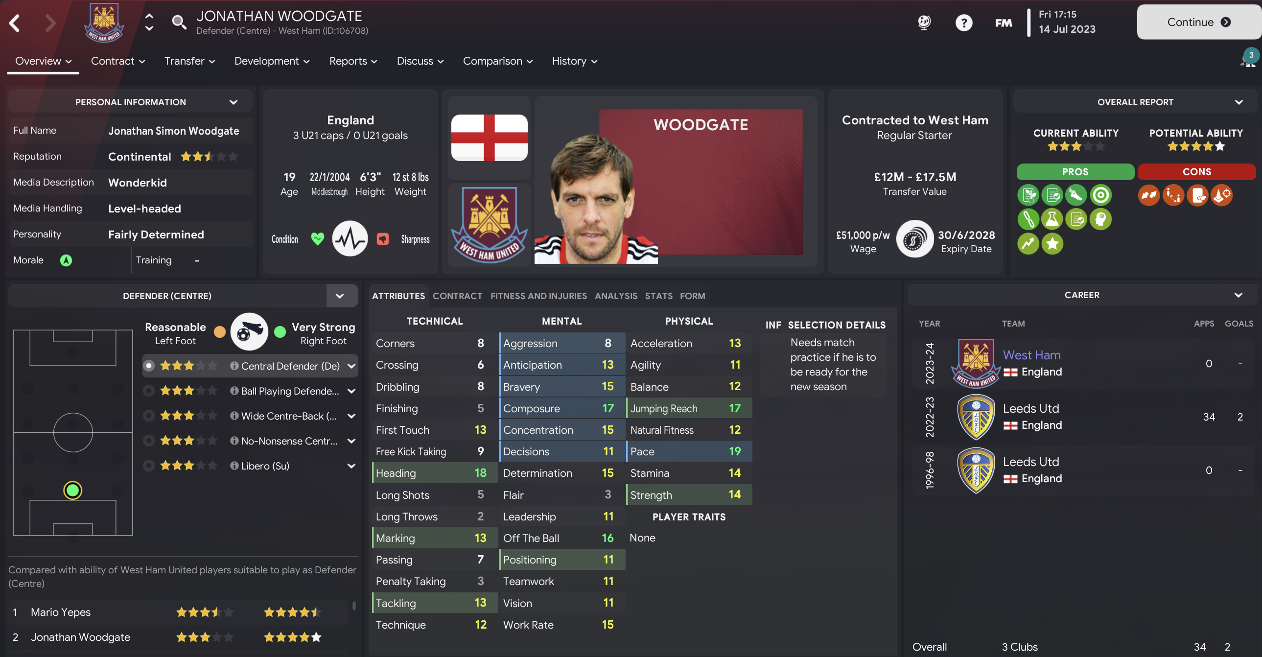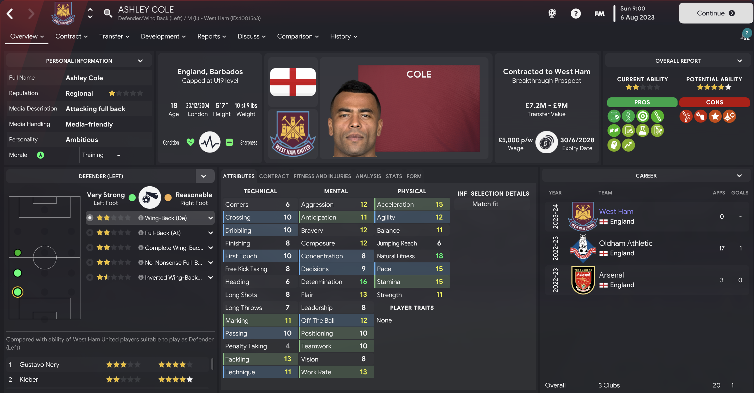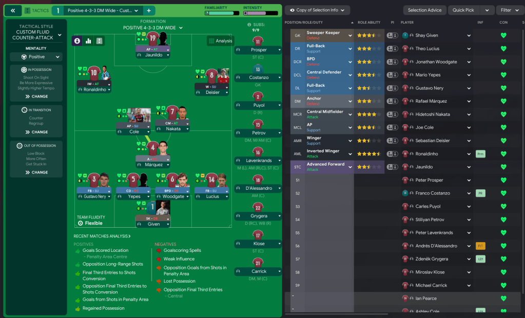 Elsewhere, the defence needed plenty of work, which began with Mahtal making the Puyol deal permanent. He was also in massive need of a goalkeeper that wasn’t foreign, so turned to Shay Given for £6m from Newcastle. Mahtal sold both left-backs Julian Dicks and Scott Minto and replaced them with Gustavo Nery and Kléber for £3.8m combined. He replaced Ferdinand with PSV’s Theo Lucius for £3m and a fellow English wonderkid in Jonathan Woodgate for £15m. But those weren’t the only additions, as Mahtal added Ronaldinho’s former teammate Jaunildo (who I couldn’t find any information about in real life) for £2.5m then another English squad member in left-back Ashley Cole, who signed for £5m rising to £9m from Arsenal.