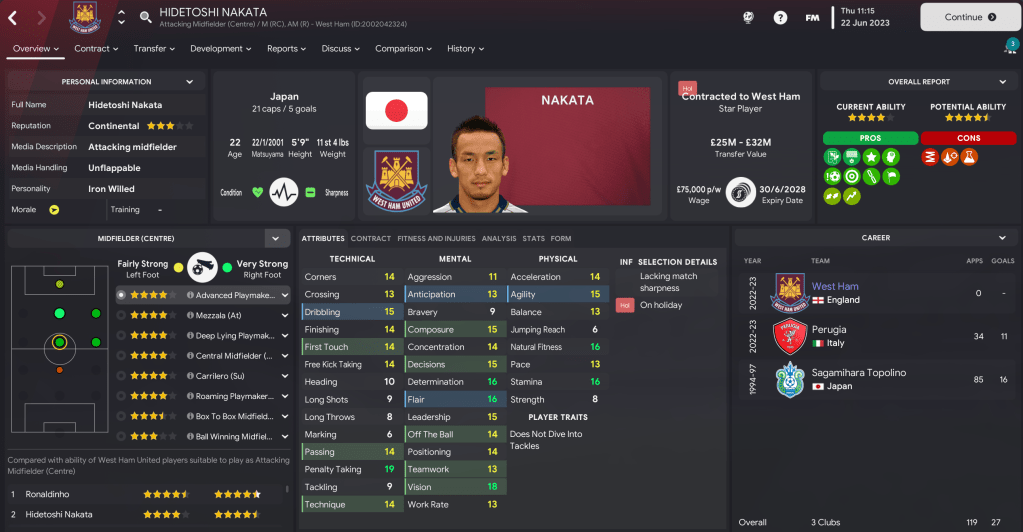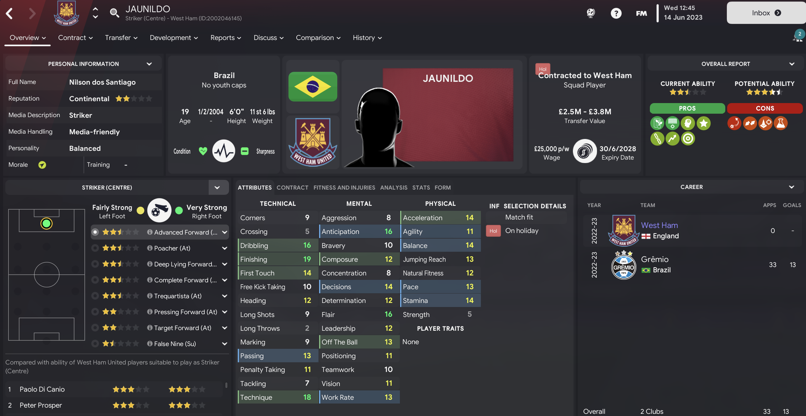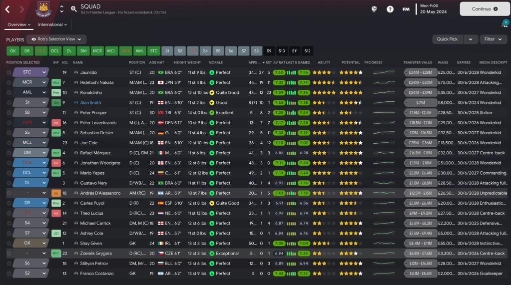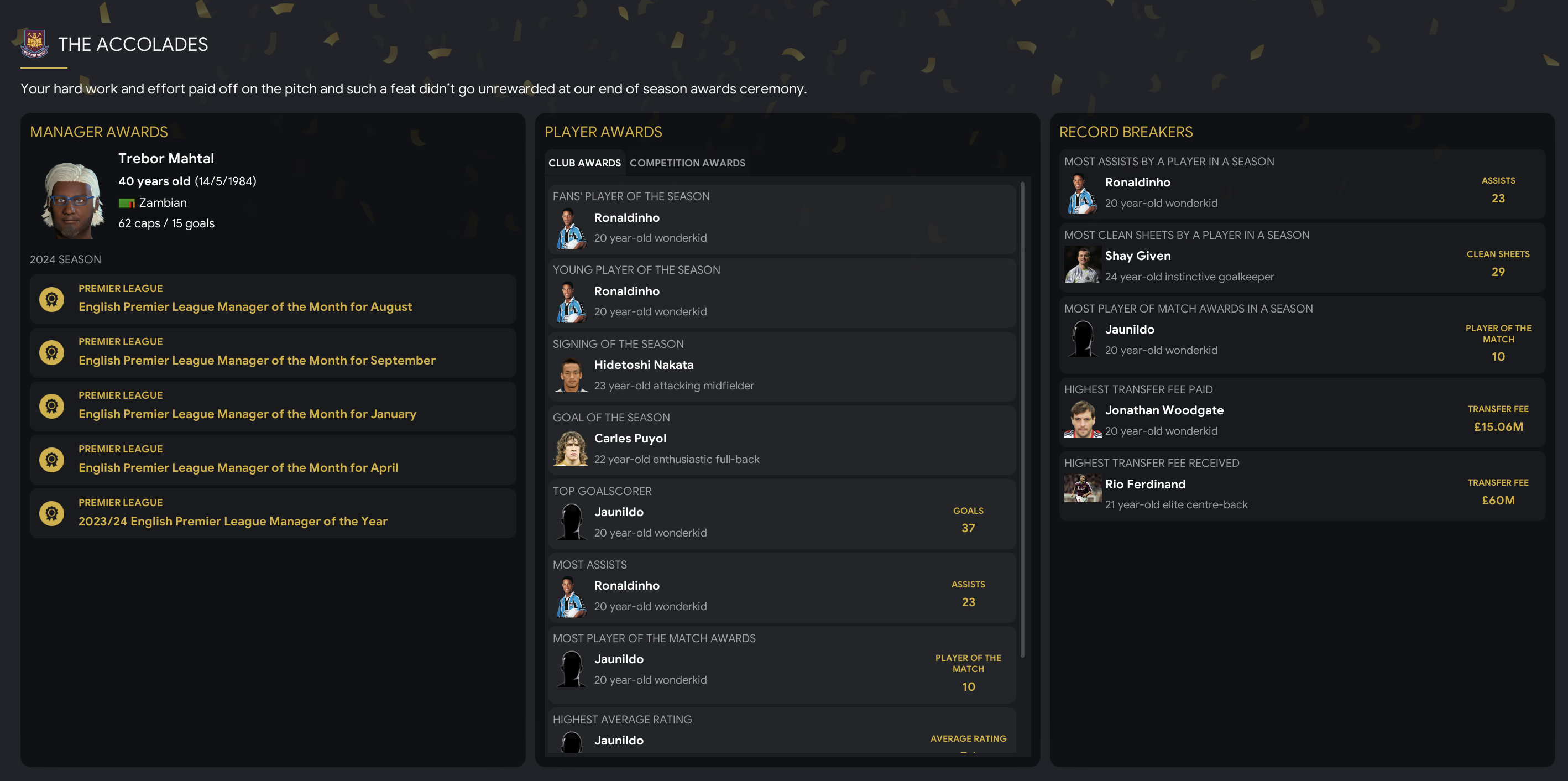 Ronaldinho and Jaunildo have been a revelation at West Ham. Ronaldinho got 23 assists and 12 goals with a 7.59 average rating but was just edged by Jaunildo’s 37 goals, 5 assists and 7.60 average rating. Nakata was equally good with 19 goals and 11 assists, while Smith scored 10 in 15, Cole got 12 assists and Løvenkrands got 11 assists.
