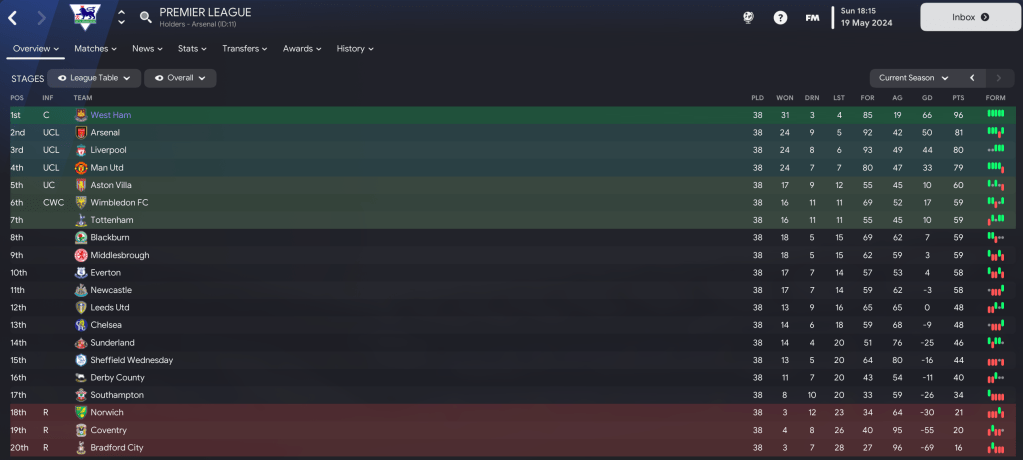 The Hammers began the year with a six-game unbeaten run as Smith scored three in three then scored again in a 2-1 loss at Man UFC. They also lost 2-0 at Arsenal but held a 9-point lead going into the final 10 games. A 2-2 draw at home to Liverpool enabled Arsenal to close the gap to 7 but West Ham kicked on, including a 7-0 hammering of Sheff Wed led by a Jaunildo hat-trick and Ronaldinho brace and a 4-0 thumping of Blackburn thanks to a Jaunildo double.