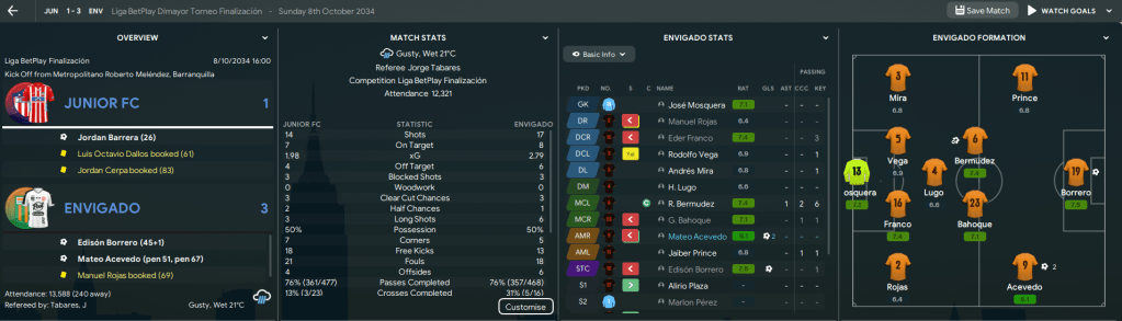 Another youngster stepped up as Lazaró again rotated fully for the continental semi. 16-year-old midfielder Cristian Ortiz started just his second league game and scored his first senior goal and created another in a 3-1 win over Petrolera. But their two main men sealed a huge win over 2nd-place Junior as Borrero and an Acevedo brace moved Envigado eight points clear.