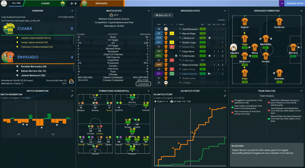 Cuiabá started the better but Envigado made the first move as a great run down the left saw Prince tee up Bermudez for the opener. Acevedo went close before a delicious pass from Diego Mena put Borrero through and he doubled the lead in style. Seven minutes after the break, the game looked done as Bermudez picked out centre-back Johann Betancurt for his first goal of the season. And it got even better as Acevedo set Borrero through to double his tally and seal a crushing 4-0 victory.
