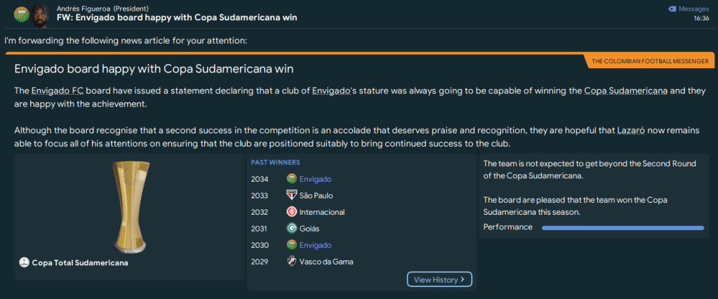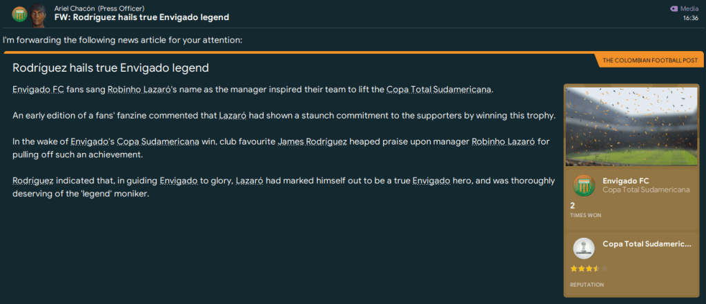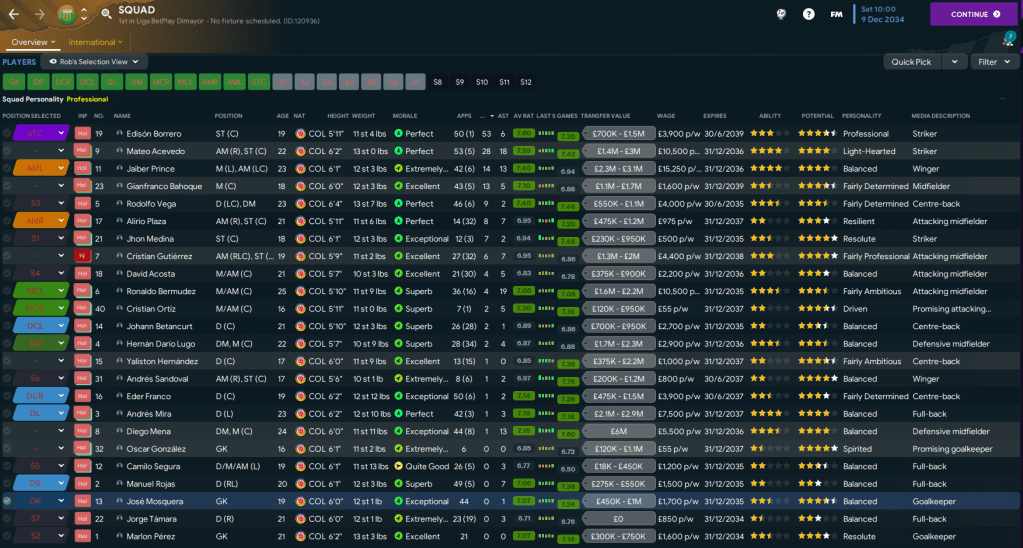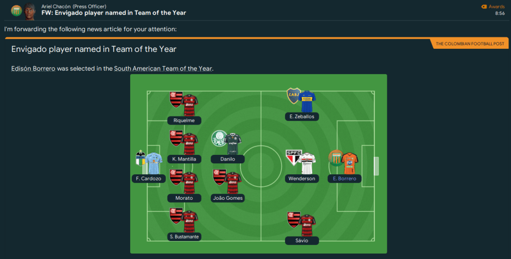 The star of the season was the exciting Borrero, who scored a ridiculous 53 in 51 games with a 7.60 average rating. He broke the club and league records for most goals in a season in the process, and he’s only just turned 19! As a result, he deservedly won the league’s Player and Young Player of the Year awards with Acevedo second in the former and Franco second in the latter. Even better, he was named in the South American Team of the Year!