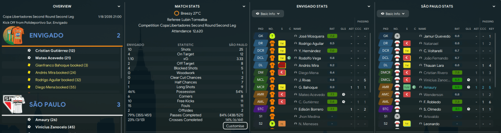 Envigado’s group win saw them handed a second-round tie with four-time winners Sao Paulo, who won the tournament as recently as 2031. The away leg was first up and Lazaró took a defensive approach, which started well as free-scoring striker Edisón Borrero scored inside 30 seconds to give them something to hold onto. Sao Paulo had the best of things and eventually equalised after an hour. But that man Borrero doubled his tally by latching onto a through-ball from Gutiérrez, who sealed an impressive 3-1 victory late on. Back on home ground, Gutiérrez and Mateo Acevedo gave them a great start with two goals in 21 minutes. And, for the second time in a month or so, they survived a comeback to progress 5-4 on aggregate.
