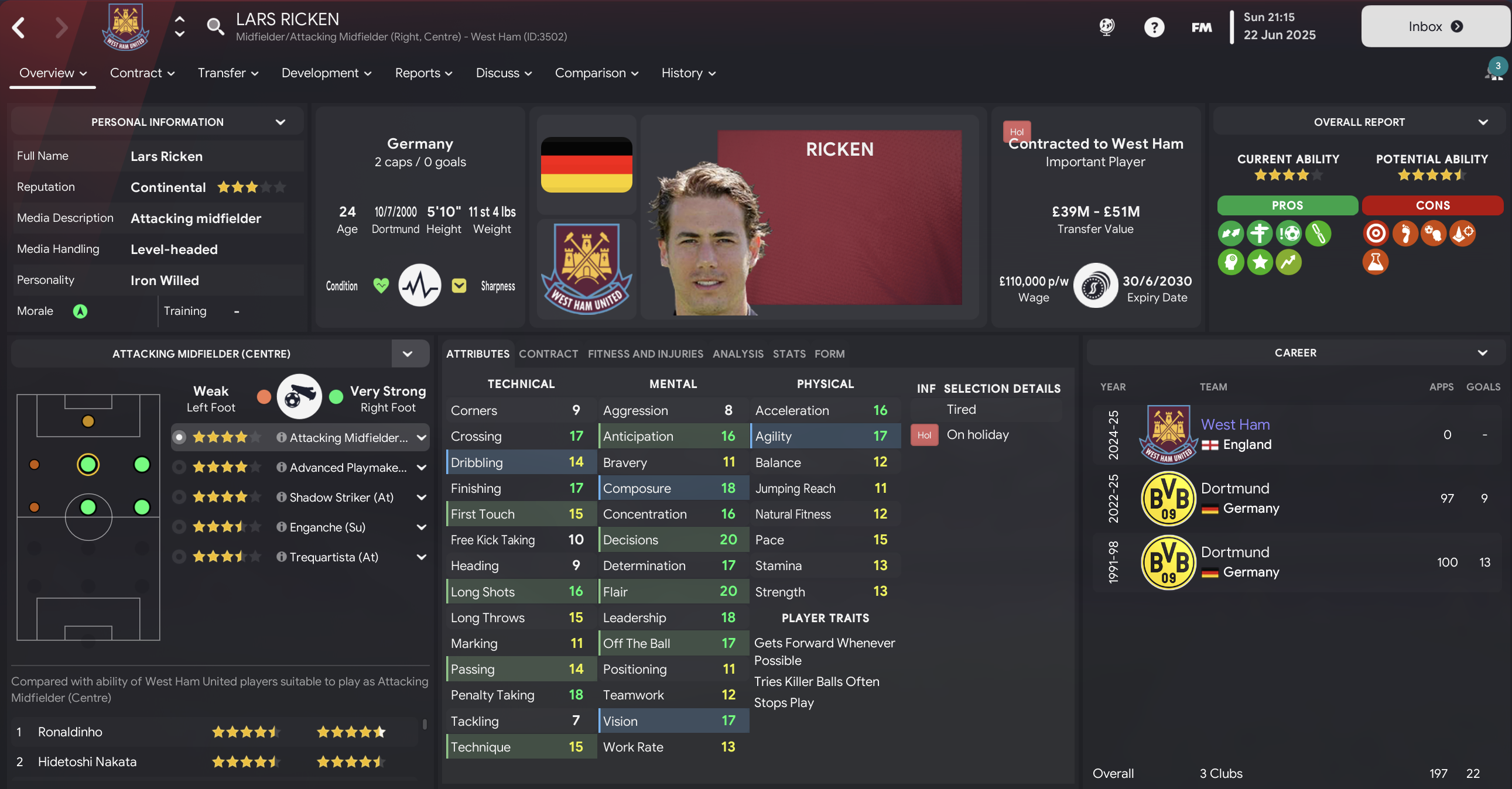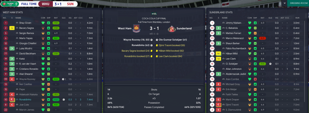 The final 5 years of life at Upton Park were a resounding success, wrapping up all 5 titles and winning a Coca-Cola Cup en route. Rooney led the way with 49 goals in 47 games but Ronaldinho remains the main man with an incredible 30 goals, 28 assists and 7.95 average rating in 55 games. Shearer, now 33, scored 25 in 45 followed by Nakata (20), Cole (14) and Beckham (9), while Cole got 25 assists followed by Nakata (17), van der Vaart (11) and Beckham and Sagna (9).