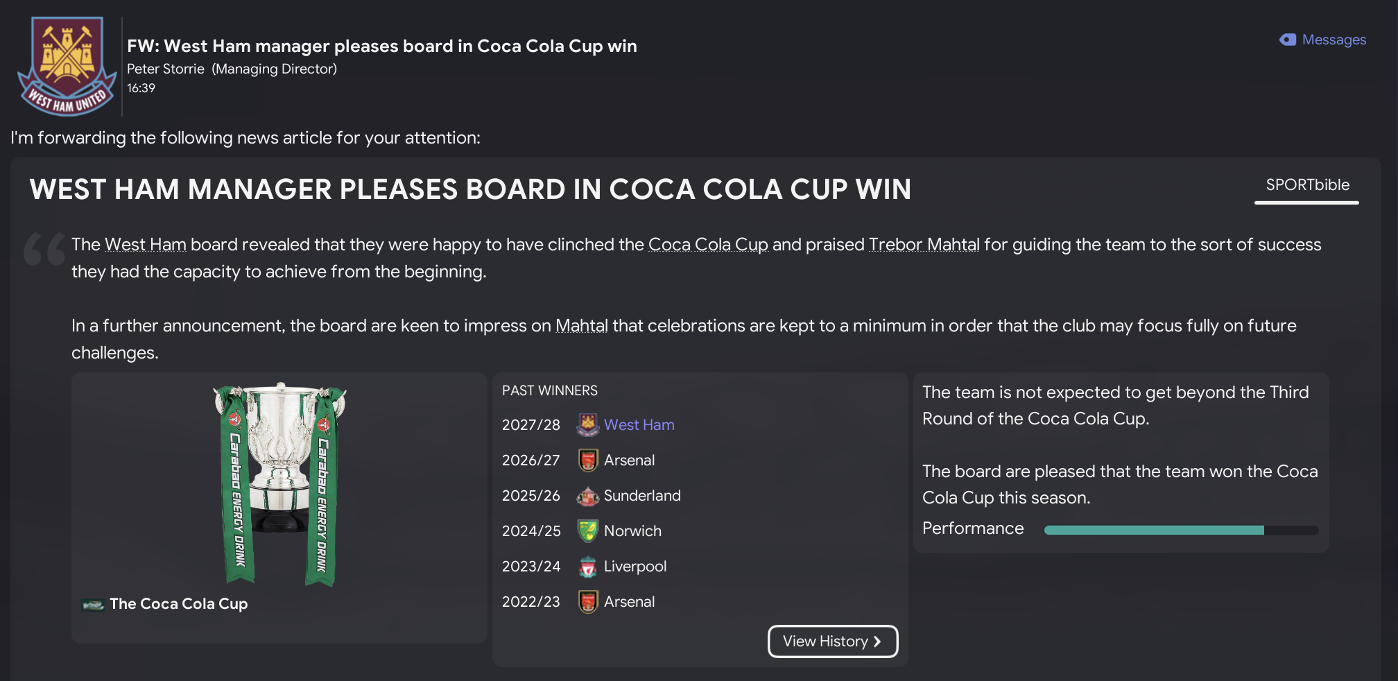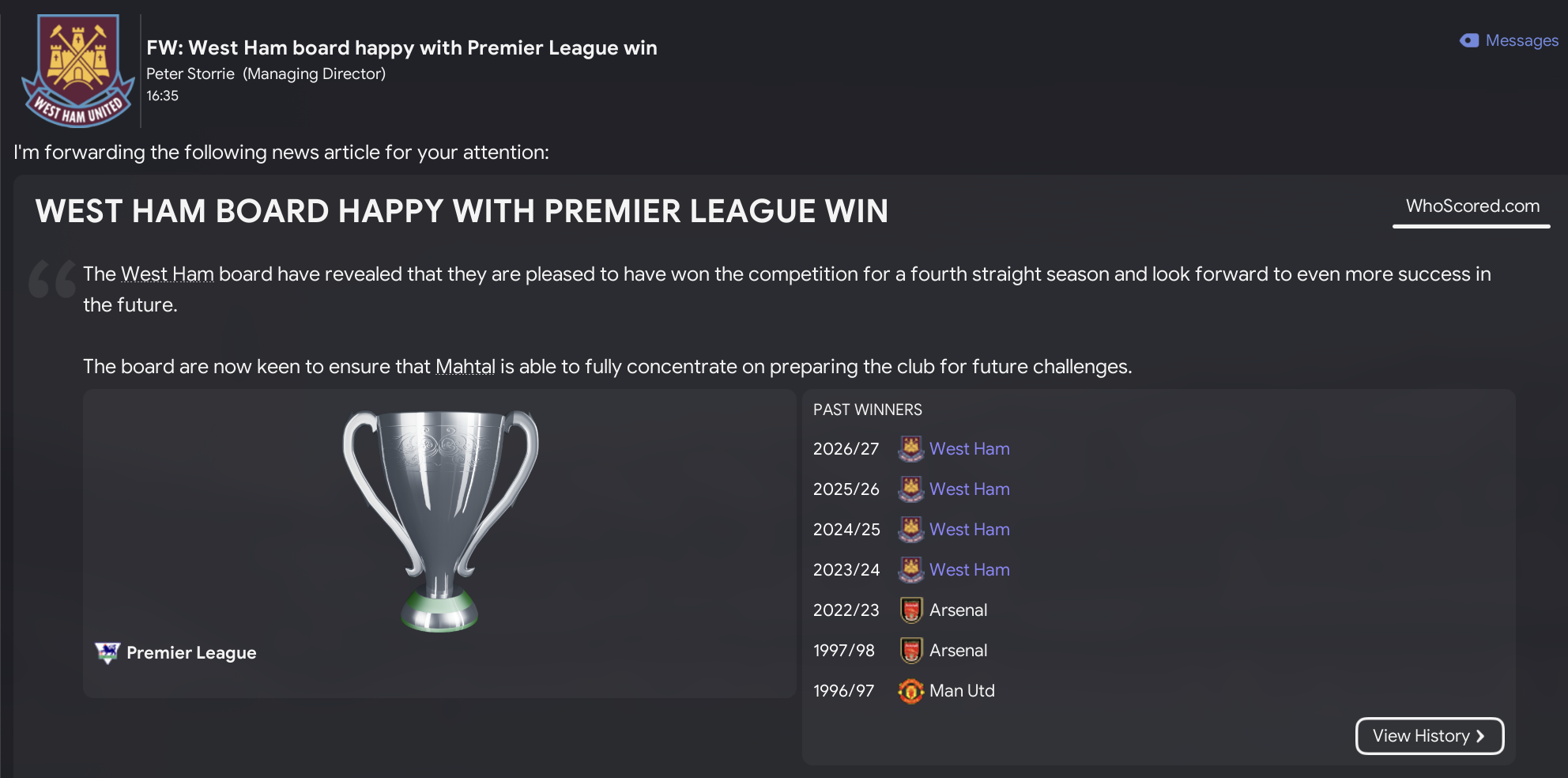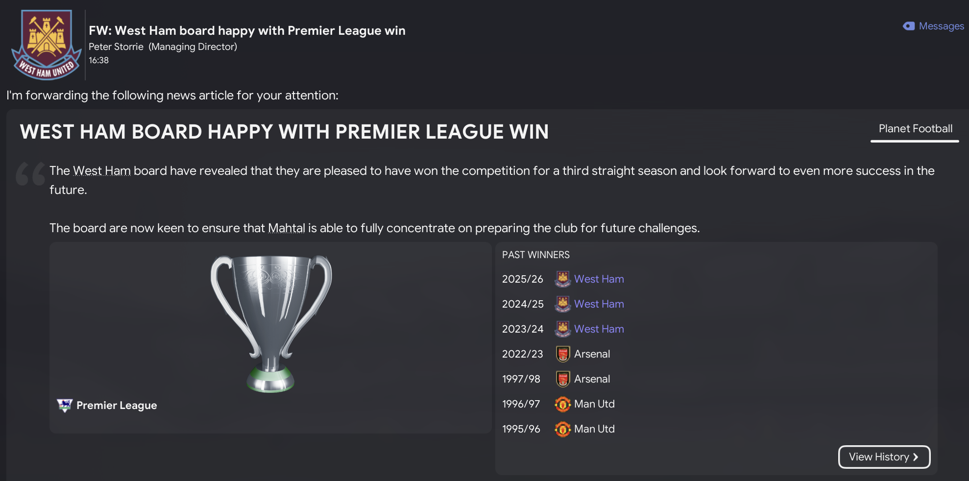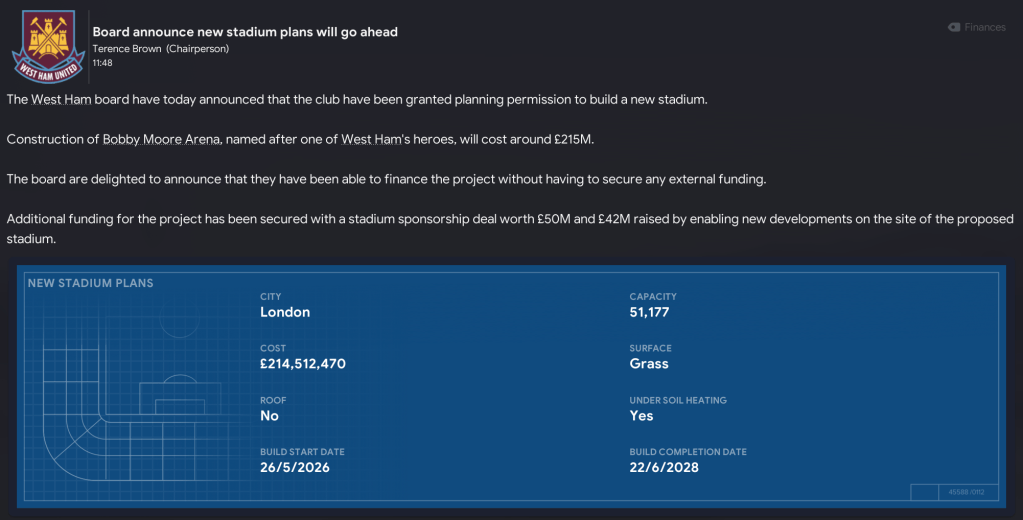 For what has to be an FM23 first, the West Ham board accepted Mahtal’s request for a new stadium to be built with plans due in 2027. So, I thought we’d skip ahead to that point to see how Mahtal’s rebuild progresses.