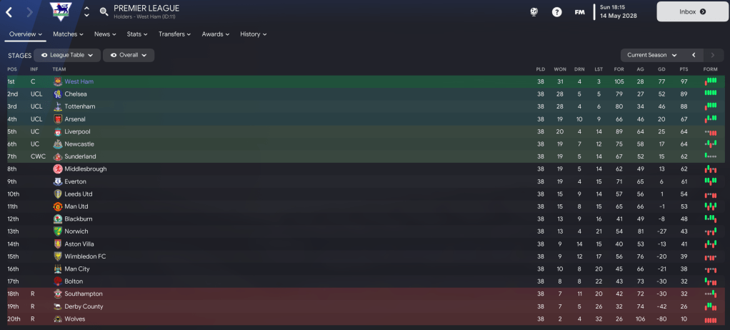 West Ham wrapped up a 4th successive title in style, hammering Villa 5-0 led by Rooney’s brace. And they eventually won the title by 7 points from Chelsea, scoring 86 and conceding just 28. Ronaldinho was the best player in the league with a 7.80 average rating, 18 goals and only 4 assists in 30 games. But Nakata got the most assists in the league with 17.
