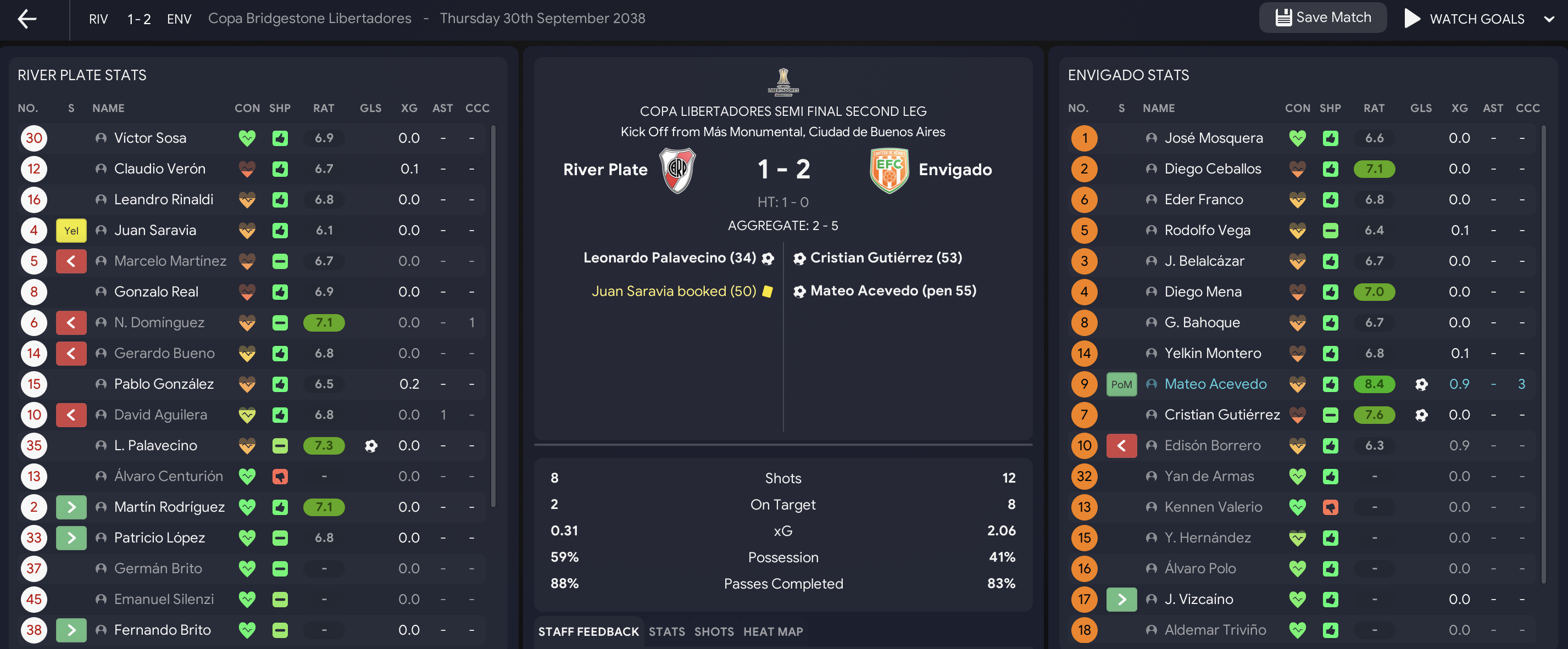 That teed up a third successive semi-final, this time against River Plate, while Internacional and Santos faced off in the other. Envigado came out flying in the home leg as both wingers Acevedo and Cristian Gutiérrez scored inside 18 minutes. Borrero made it three just after the break but River got one back with their only shot on target, and Envigado ran out dominant 3-1 winners. And they were just as good in Argentina as Gutiérrez and Acevedo scored two in three minutes just after the break to seal a 5-2 aggregate success. Envigado were heading back to the Copa Libertadores Final to defend their crown!