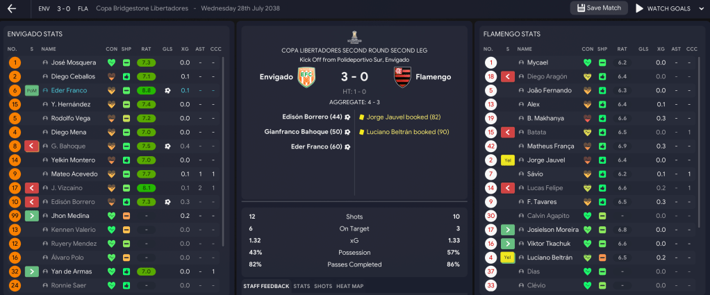 Just like last year, Envigado won their group only to draw Flamengo in the second round. On the positive side, that went well for them last season. So, amid a slight defensive injury crisis, Lazaró took the same defensive approach into the first leg at Maracana, which worked to an extent as they limited Flamengo to a 3-1 win after being battered by 23 shots to five. However, their impressive home form again saw them through as Edisón Borrrero, Gianfranco Bahoque and player of the match Eder Franco sealed a 3-0 victory.