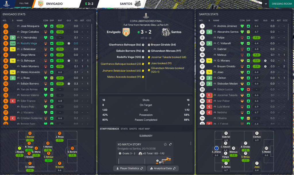 The first half was pretty forgettable but things got really got going after the break. Santos got a deserved goal after 54 minutes only for Envigado to go down the other end and Borrero flicked the ball on for Bahoque to equalise. Envigado got on top and both sides had decent chances but it ended 1-1 and went to extra-time.