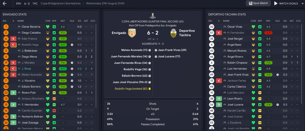 Finishing 2nd in their group really hampered Envigado as they took on Vasco da Gama in the second round, while group winners Santos faced Universidad de Chile. The home leg was up first and a pretty terrible first half was instantly forgotten by three goals in six minutes. Centre-back Eder Franco, who also wants to leave, opened the scoring, Vasco immediately equalised but striker Edisón Borrero nicked a 2-1 win. They were even better in Brazil as Borrero scored in the second minute and doubled his tally just after the break to seal another 2-1 win.