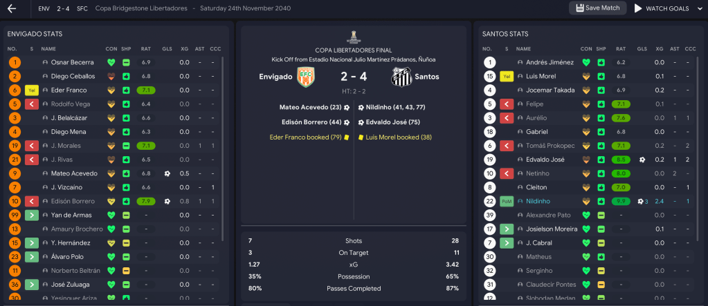 And, for the third time, they again took on Santos in the Final. However, this time Santos and, specifically, their incredible striker Nildinho had too much for Envigado. Acevedo gave them the lead early on but Nildinho hit a brilliant hat-trick to inspire victory for the Brazilians.