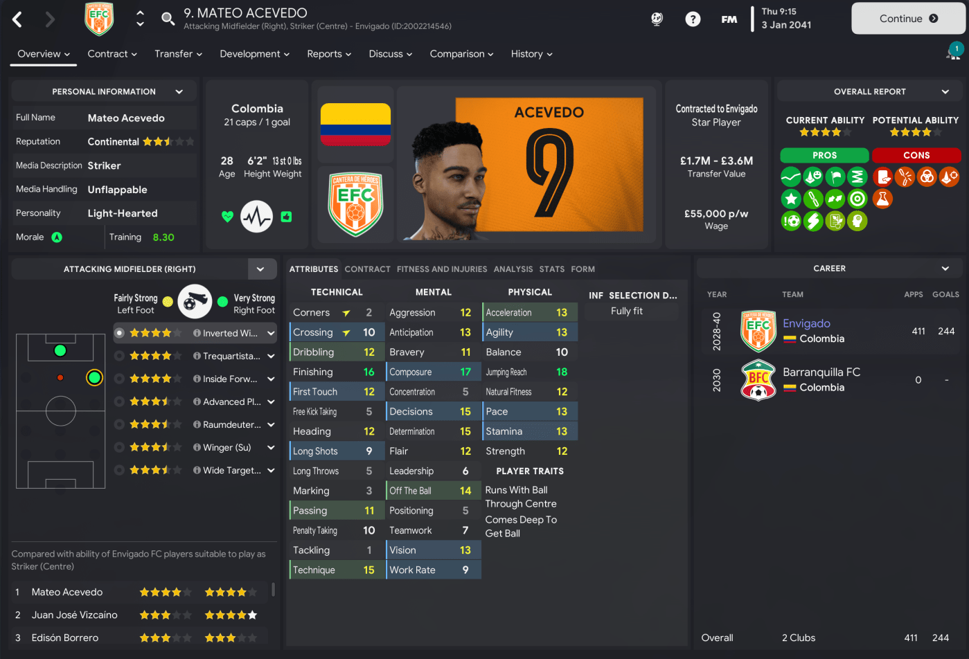 Those minimal transfer values were one of Lazaró’s biggest frustrations at Envigado, as it made it virtually impossible to keep any player that showed promise. For example, Lazaró went and handed out new contracts to his remaining key players. That included new best player winger Juan José Vizcaino, who signed a new £23.5k deal but was still only valued at £4.2m.
