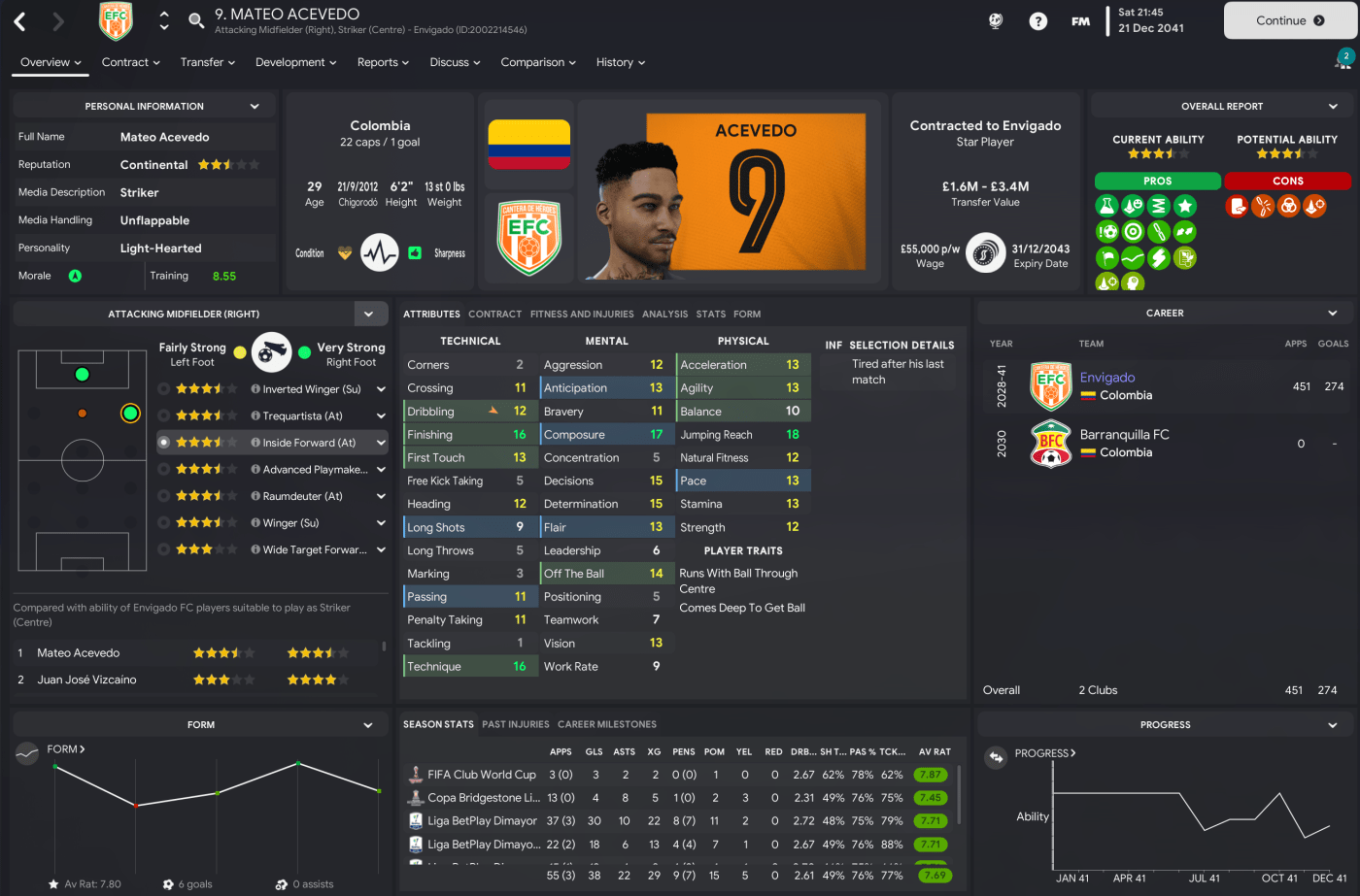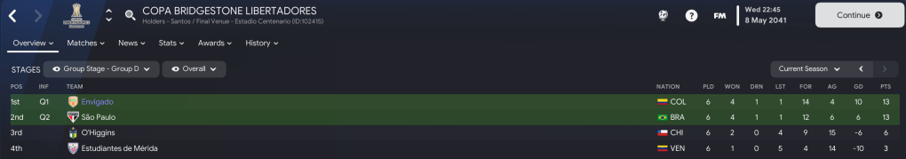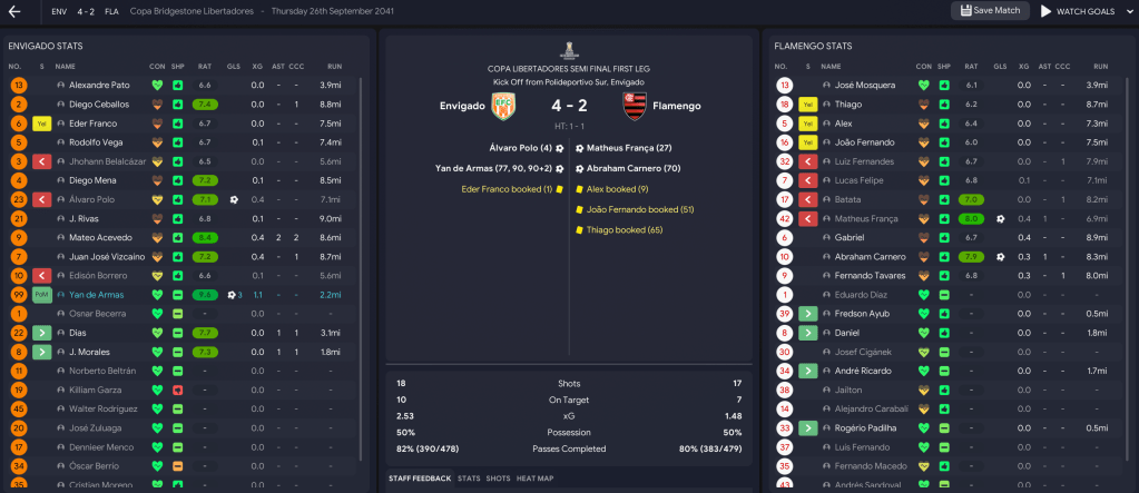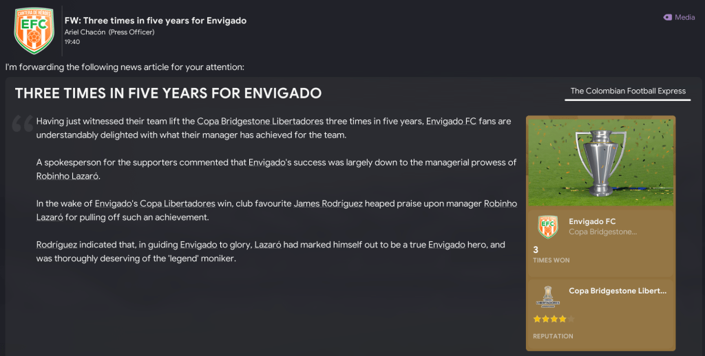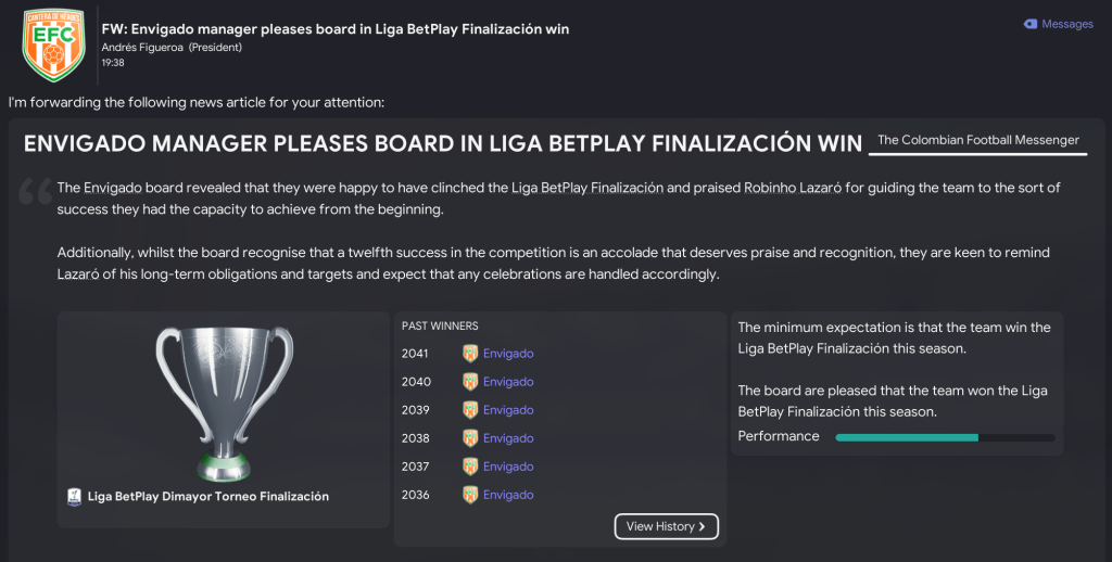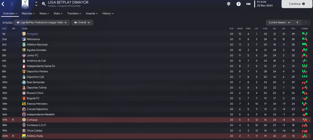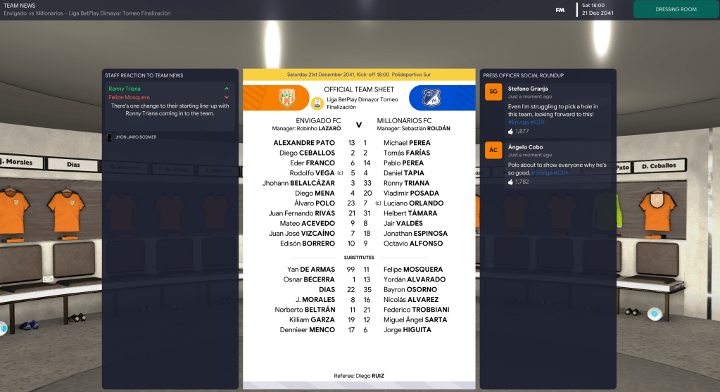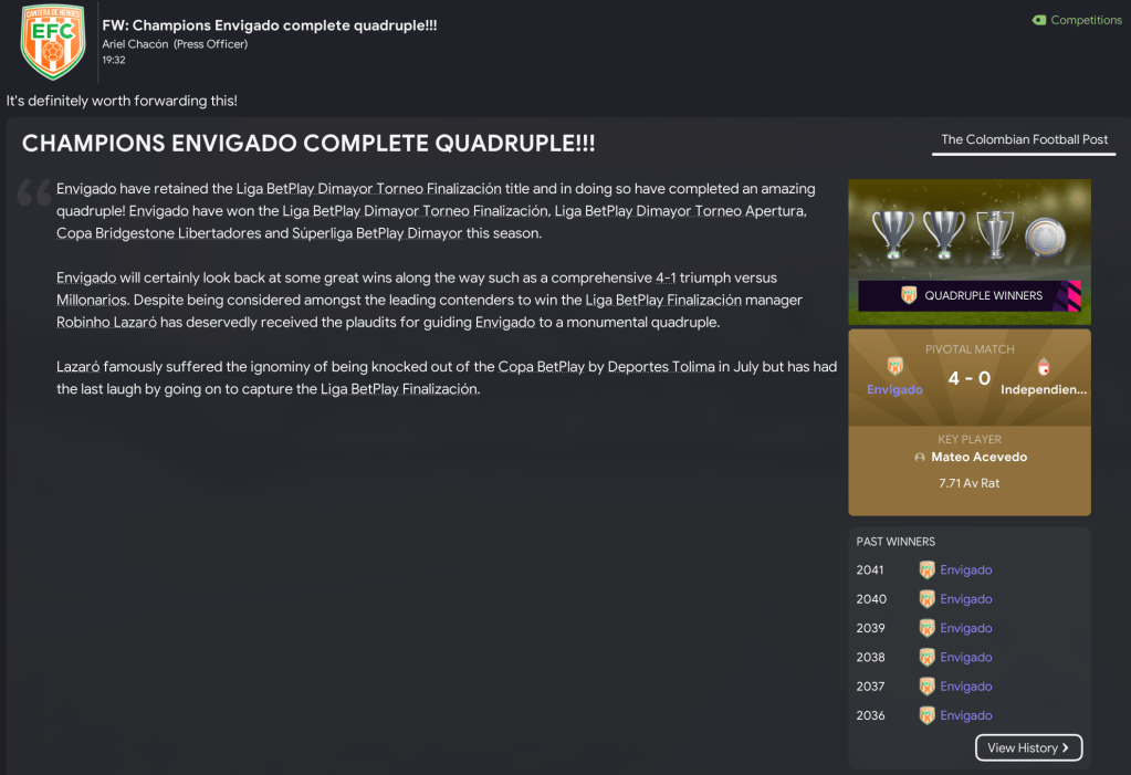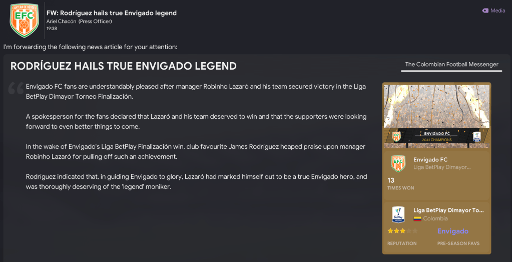 That teed up a final against the second-most successful side in Colombian history, Millonarios. But Envigado showed their dominance again in the first leg as the brilliant Acevedo ran riot with an 18-minute hat-trick in a 4-1 victory. The second leg took place the day after Lazaró celebrated 20 years in charge of Envigado on 21 December 2041. And Acevedo was at it again, scoring a penalty before Vega headed home to seal a comfortable 6-1 aggregate success.