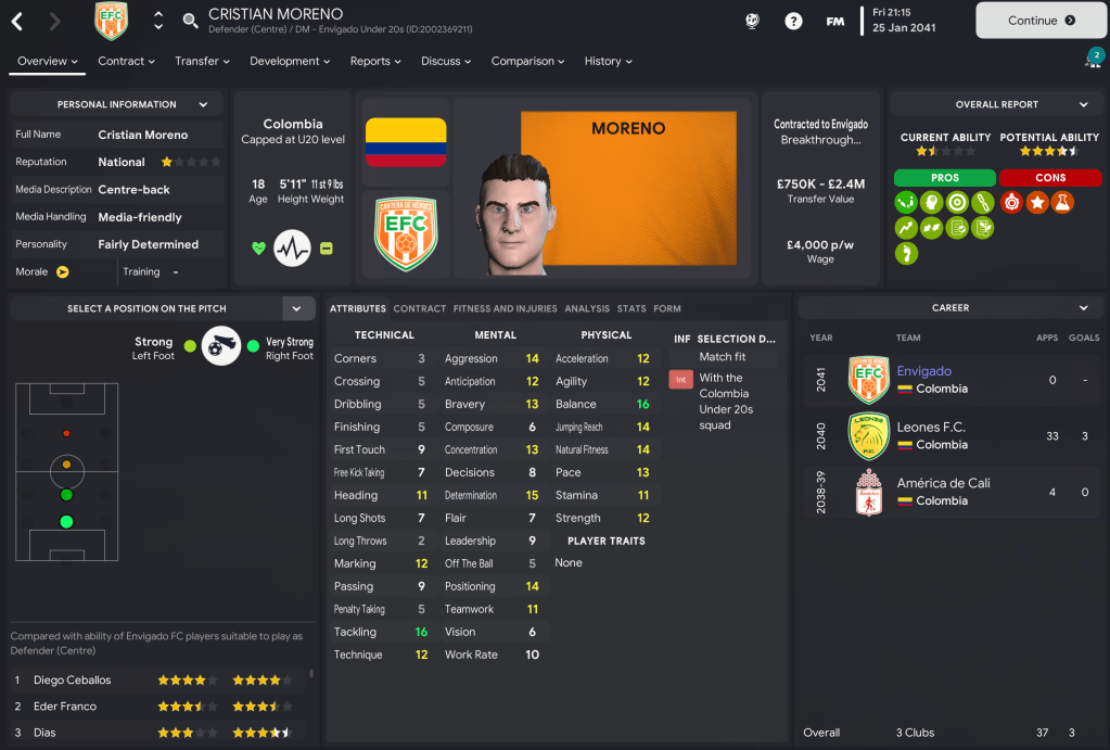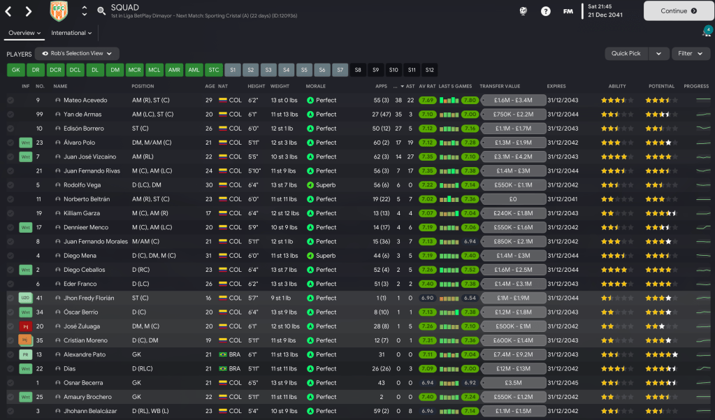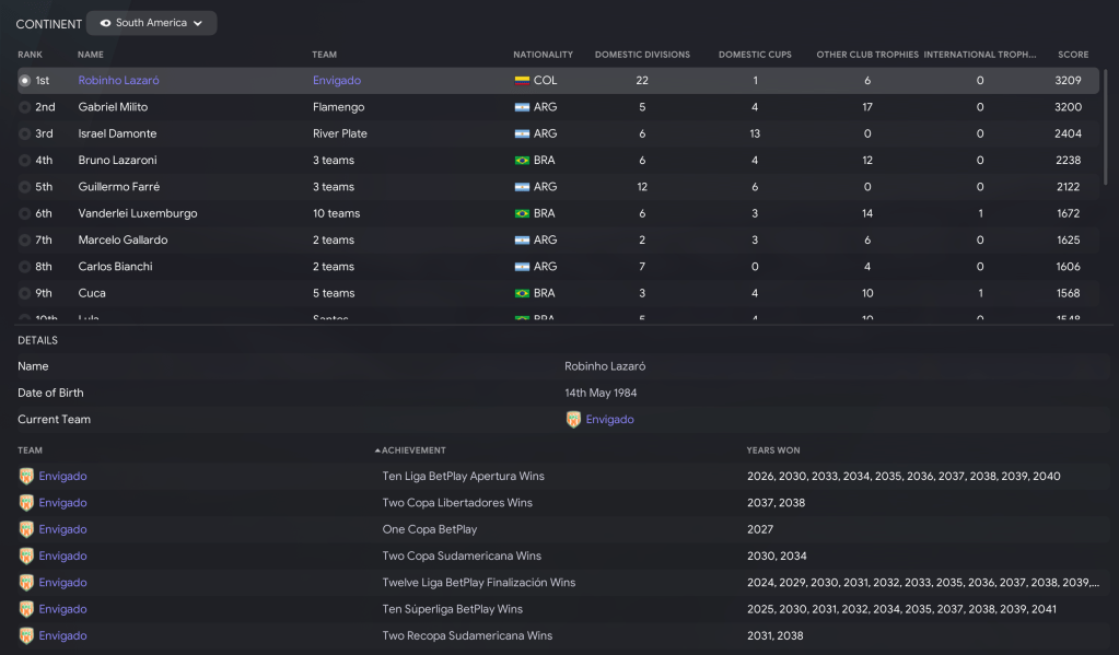 This save effectively concluded in Part 37, as Lazaró extended his record to 22 titles. He now abandoned his homegrown-only approach to see how his side would fare by trying to spend the considerable transfer kitty he’d amassed. That began at the end of last season, as he upped the club’s scouting capacity to search all of South America in a bid to try and discover some of the best talent across the continent. However, he was going to retain his focus on young players and couldn’t go too wild as he was only allowed to register four non-Colombians.