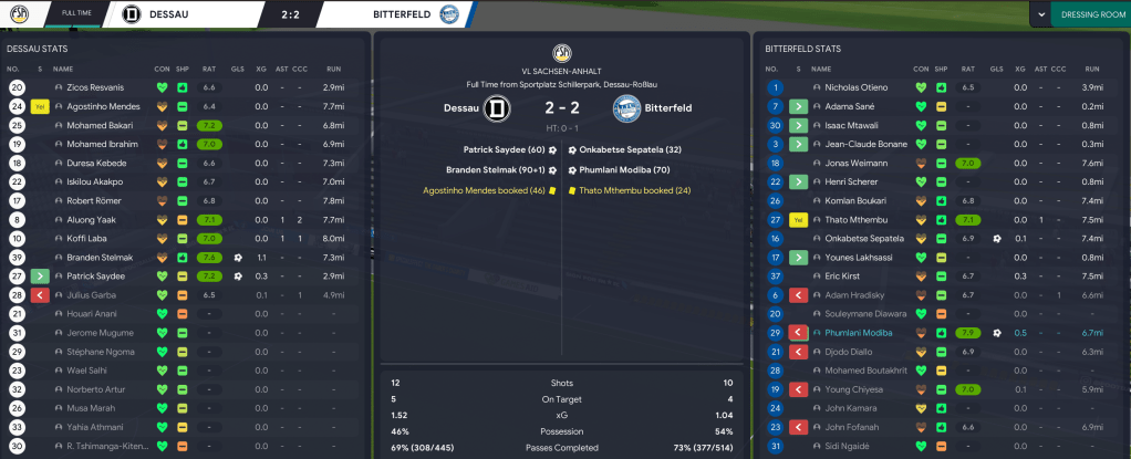 Upon Prusseit’s arrival, Dessau were already three games into their season and had won one, drawn one and lost one. So his first-ever match as a Football Manager took place just two days after he was appointed. And truth be told, he didn’t really know what formation to play or which players to select, so he initially went with a 4-4-1-1. But that didn’t work as they wasted chances and gifted Bitterfeld a goal with their only shot of the first half. So he moved to a 4-4-2 and they just about nicked a 2-2 draw.
