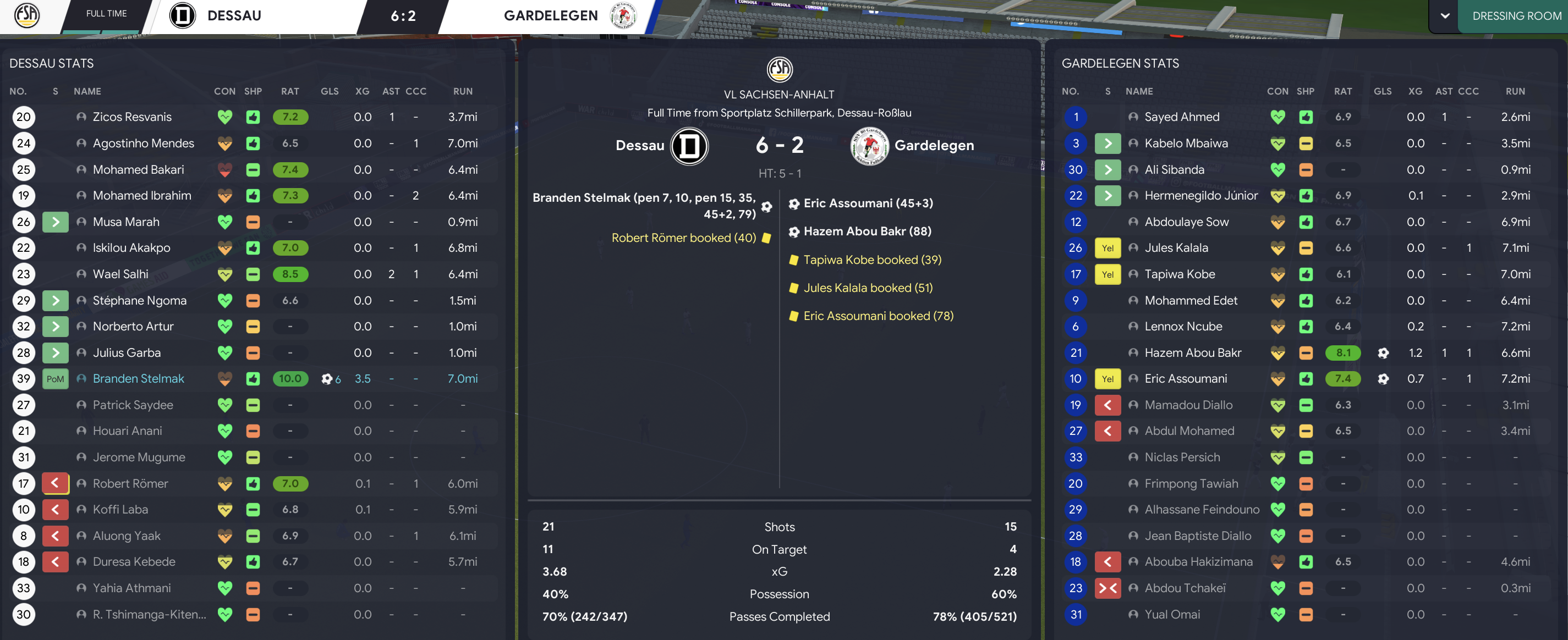 His first away game followed at Barleben and they were a little unlucky to lose 2-1. A switch to 4-3-3 at home to Gardelegen worked wonders as Stelmak scored a penalty after seven minutes, hit a 30-yard screamer two minutes later and wrapped up his hat-trick with another penalty inside 15 minutes. Not done there, Salhi teed the striker up for a 4th after 35 minutes then he latched onto a Resvanis clearance to slam home a fifth! The second half was quieter but Stelmak added a superb sixth as he curled home a 25-yard free-kick for a 6-2 victory.