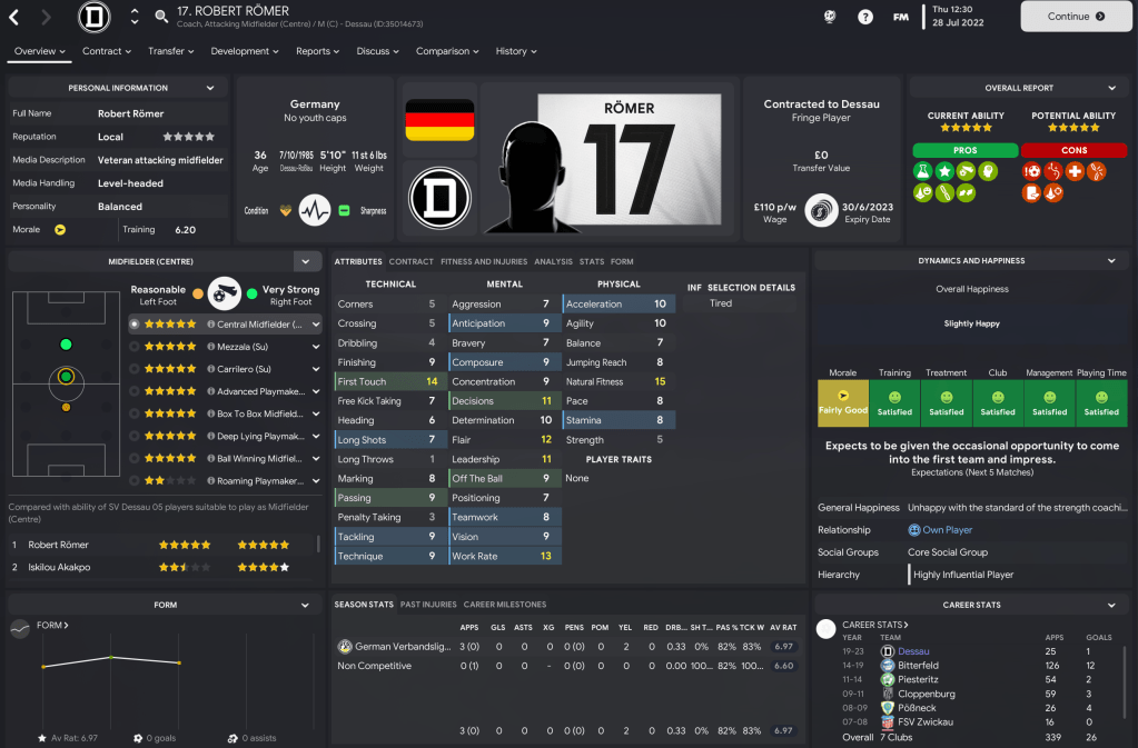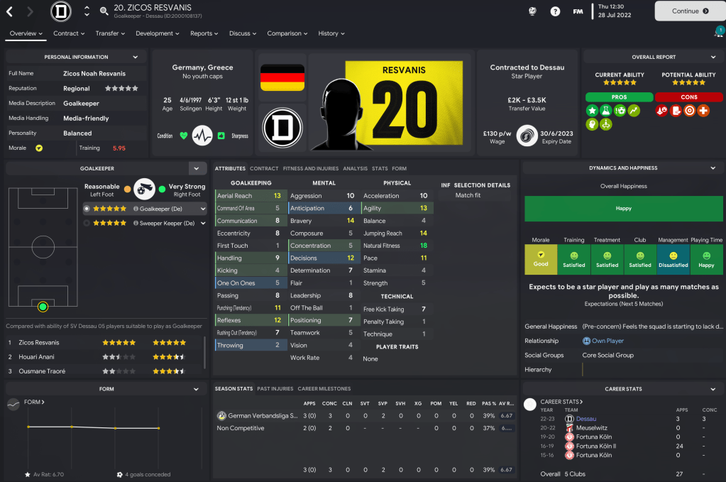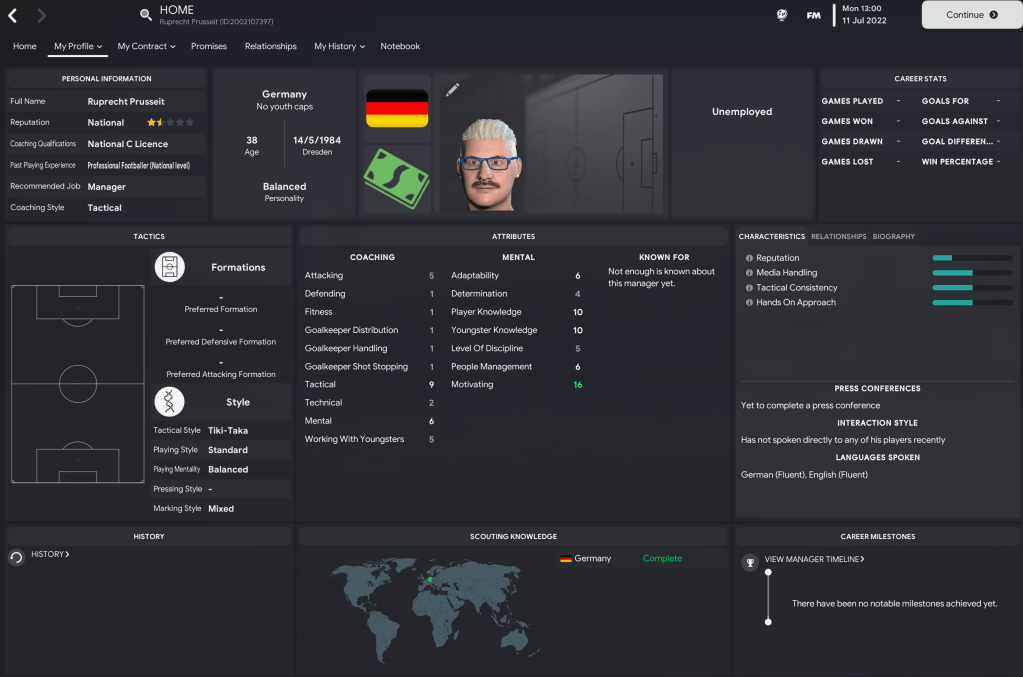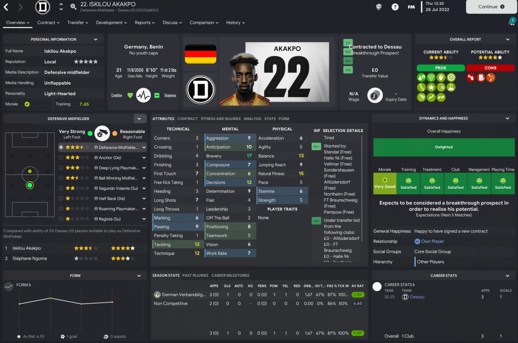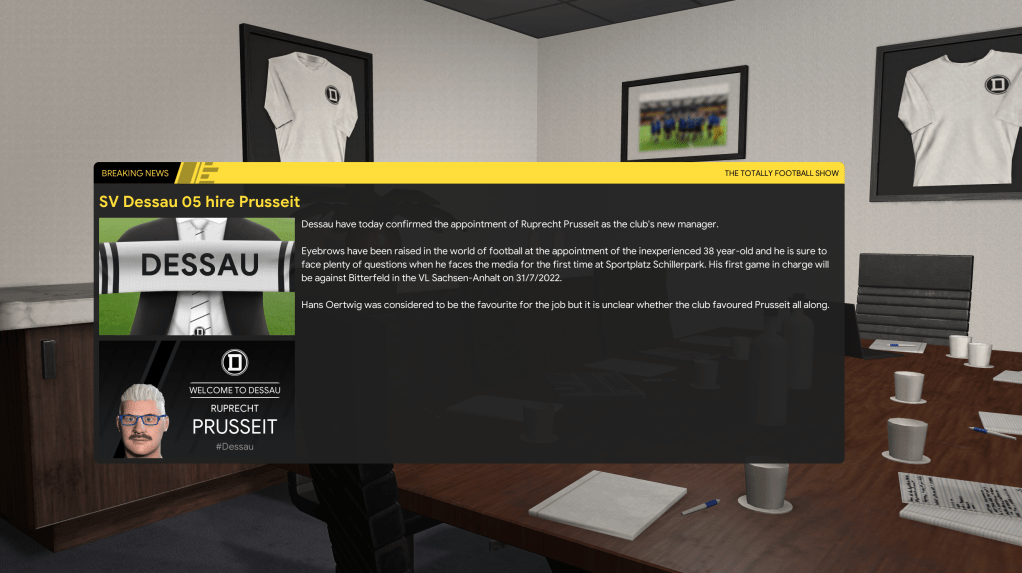 Upon loading up FM23, two playable East German clubs had job vacancies. So Prusseit dusted off his CV and submitted applications to fifth-tier side 1. FC Frankfurt and sixth-tier SV Dessau 05. To his delight, his mobile phone was quickly buzzing away as both sides were keen to come in to attend an interview. First up, on 10 July 2022, was Dessau, who seemed relatively pleased with his responses and shared vision for the club. Later that day, FC Frankfurt got in touch and seemed equally pleased with Prusseit’s interaction.