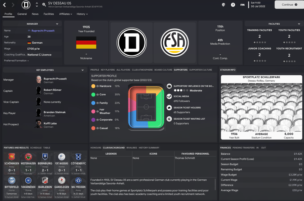 SV Dessau 05 is a semi-professional club based in the town of Dessau in the Saxony-Anhalt state. The club’s claim to fame is being the winner of the inaugural FDGB-Pokal, or East German Cup, in 1949. Die Nullfuenfer (The 05’s) club play at the 5,000-capacity Sportplatz Schillerpark. They also have terrible facilities with 2s across the board and £5,000 in the bank and no transfer budget but a £3,200 weekly wage budget of which they were spending just £1,200.