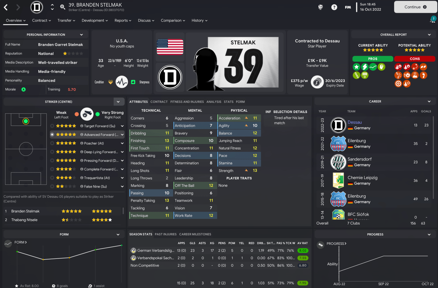 So in Prusseit’s first 10 games of football management, he’d led Dessau to six wins, two draws and two defeats, sitting in 4th place only three points off the second promotion spot. Stelmak leads the goalscoring charts with 23 in 13 and Yaak has the second-most assists with seven.