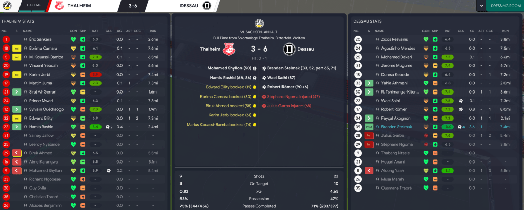 Next was a tip to 18th-place Thalheim and they dominated the early stages with Stelmak missing three great chances. But he eventually took one, then went on to bag yet another hat-trick while Thalheim scored from two goalbound shots. Stelmak added another with a brilliant volley and Thalheim obviously scored their next shot on target, but midfielder Wael Salhi scored an even better volley and his midfield partner Robert Römer tapped home from a corner to secure a wild 6-3 victory. That meant Dessau were virtually promoted, bar a 32-goal difference swing.