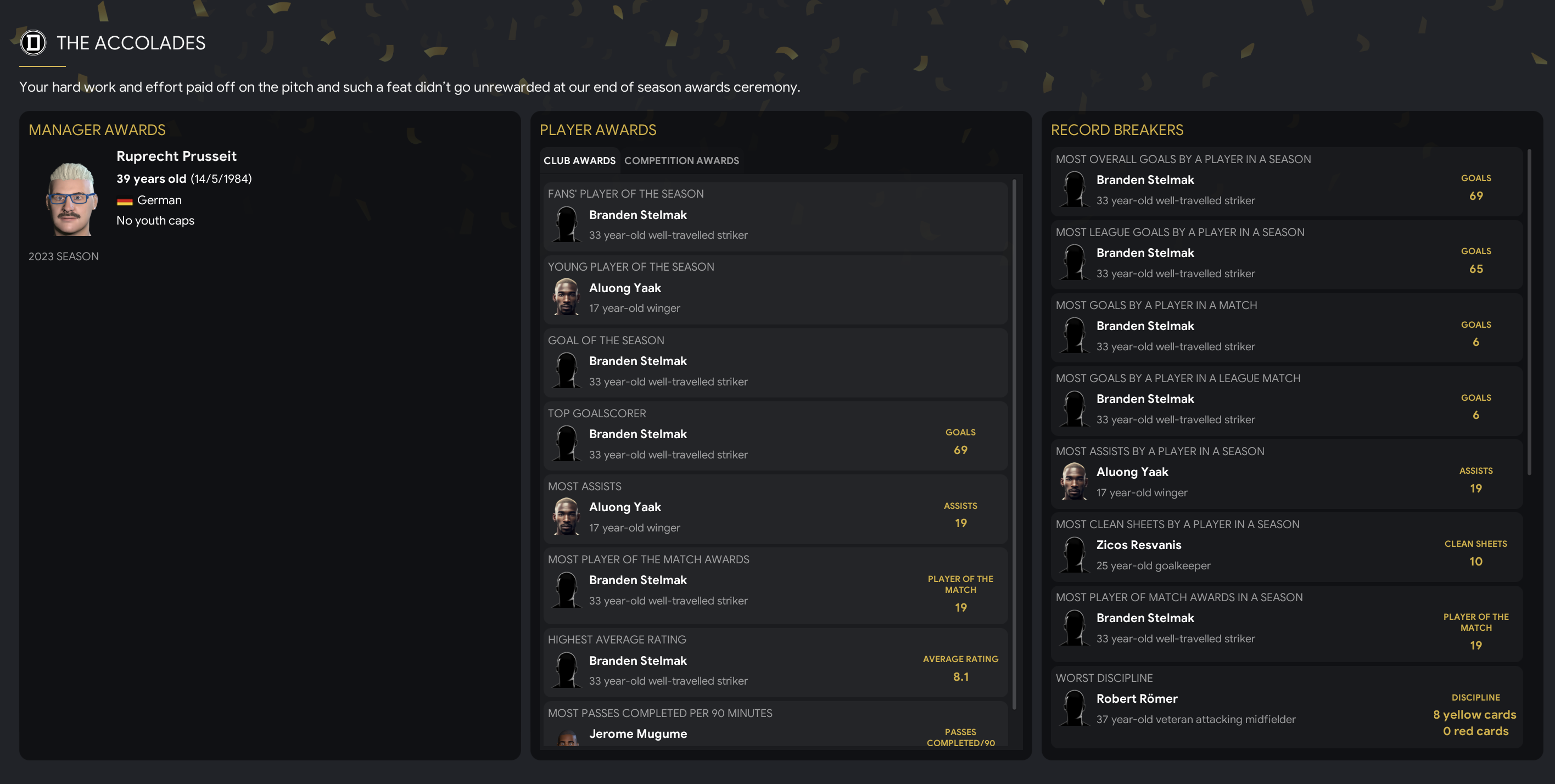 They wrapped up the campaign with a 2-1 win over Haldensleben on Prusseit’s 39th birthday, with Stelmak bagging a ridiculous 65th league goal of the season. Unsurprisingly, he was the league’s top scorer and Prusseit felt a little sorry for Bernburg’s Usman Taiwo, who scored an impressive 41. Stalmek had the best average rating of 8.16 and a superb 18 player of the match awards, while Yaak topped the assists chart with 18 with Laba in second on 13.