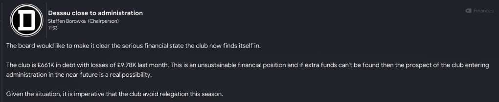 Dressau’s dwindling financial situation was becoming almost untenable to the point where it was significantly impacting Prusseit’s role. Firstly, the board decided to cease non-contract player bonuses. A few days later, the unsustainable position meant the club announced it would likely enter administration if Prusseit failed to avoid relegation. Then the board agreed a £725k loan to help the club’s running costs, which it immediately began paying off in £3k monthly repayments. In other words, the club is screwed financially!