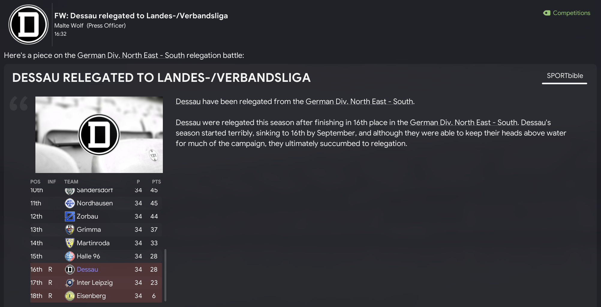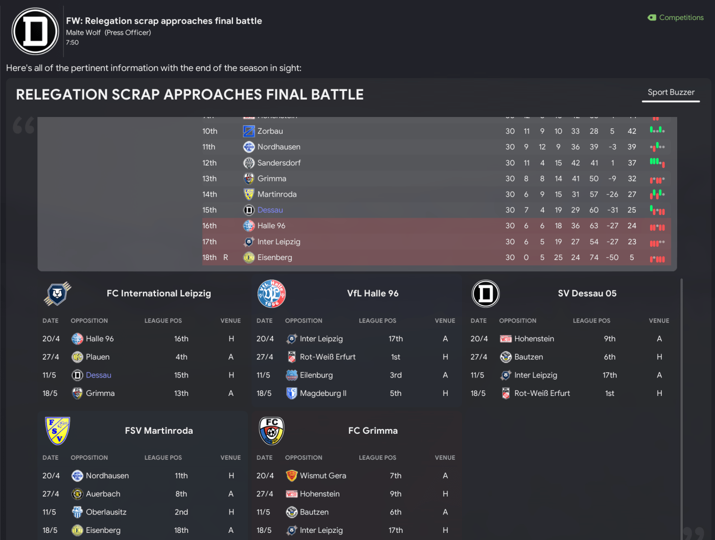 That left Dessau in a perilous position, just one point clear of relegation with four games remaining and with a pretty tricky run-in that, most likely, would hang on a big trip to Inter Leipzig.