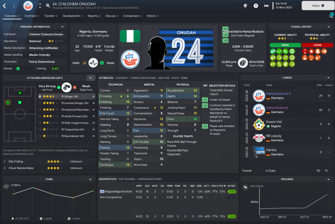 That took Rostock II to the top of Regionalliga Nordorst for the first time at the halfway mark of the campaign, having only dropped points in two games. The strikeforce of Onuoah and Schumacher have taken the league by storm with a shared 29 goals, with Onuoah leading the way with 15. While Stark tops the assists chart with 10 followed by Kaminski with seven and goalkeeper Fabian Eutinger has kept the most clean sheets (9).