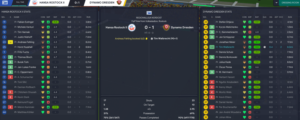 Game 4 – Tennis Borussia Berlin (12th, away): A win at home to TeBe Belin would seal the title with a game remaining, given Dynamo played their final game at the same time. However, Prusseit’s time suffered stage fright and lost 1-0 to a very dubious first-half penalty. Elsewhere, Dynamo were winning 1-0 to move two points clear but conceded a 91st-minute equaliser at Chemie Leipzig. That kept Rostock top on goal difference going into their game in hand.