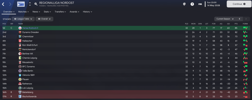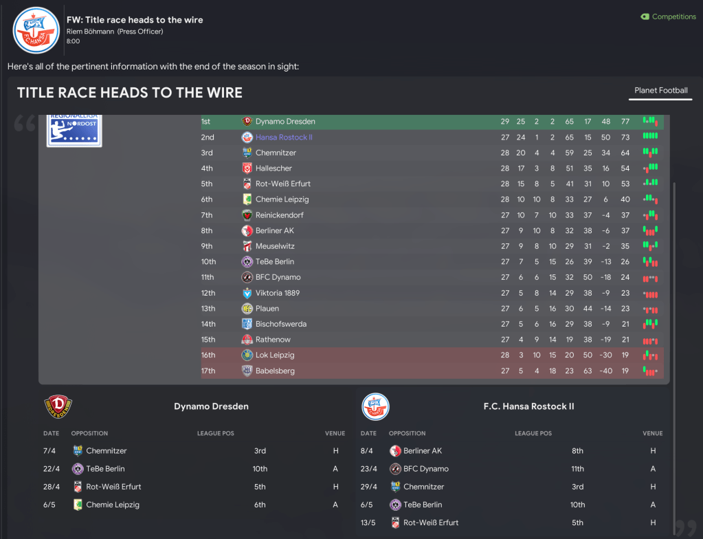 Dresden had only dropped points in three games and led the way by four points having played a game more. But they imploded in a 5-2 home defeat against rivals Chemnitzer, which suddenly shifted the momentum in Rostock II’s favour. And, bizarrely, their game in hand would be played one week after Dynamo’s final game of the season!