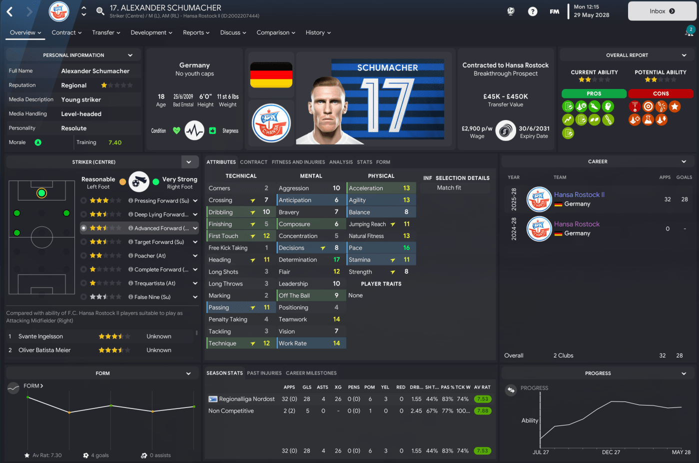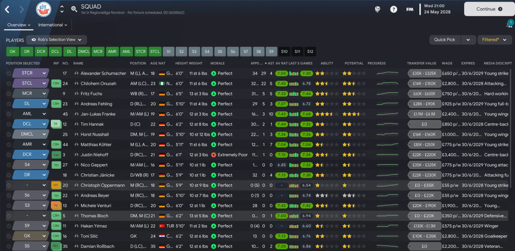 Rostock II’s star man this Schumacher, who scored 29 goals in 34 games with a 7.50 average rating. He was pushed close by Onuoha’s 22 goals and 7.45 average rating, but no other player scored more than five. Winger Franke topped the assists chart with 10 followed by right-winger Matthiäs Kohler’s seven, while centre-back Hannak got an impressive 7.44 average rating.
