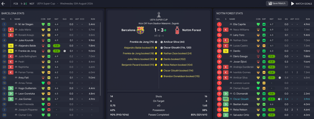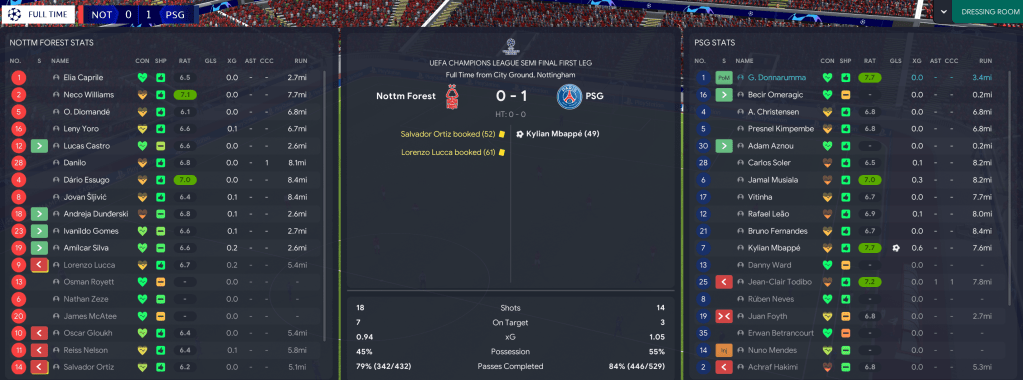 So for the 2nd time in 3 seasons, Forest were in the Champions League semi-finals. Next up was another meeting with an absolutely stacked PSG team. We just about edged the home leg but found Donnarumma in inspired form and Mbappé was again the difference as he nicked a 1-0 win. And we unsurprisingly lost 3-0 in France.