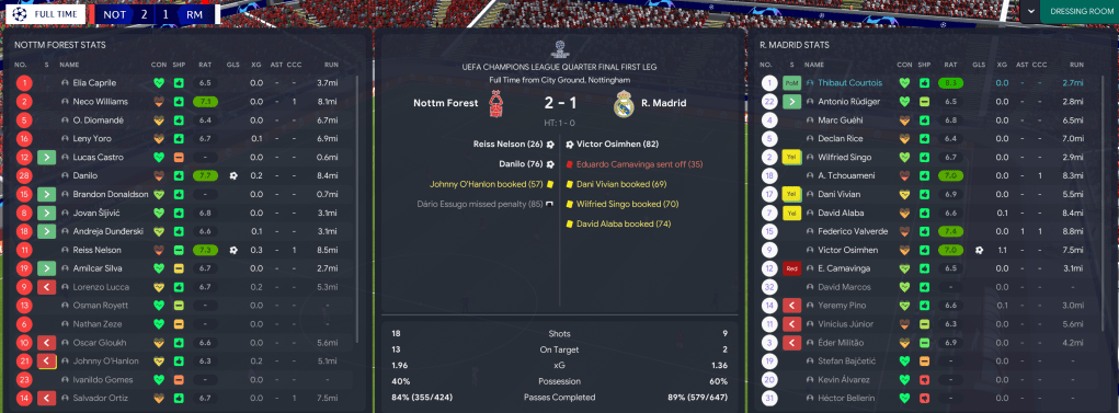 Things got a lot more difficult in the quarter-final against Real Madrid. The home leg was up first and we started really brightly, forcing Courtois into a couple of saves. And we got our reward as Nelson finished calmly after 26 minutes, and things got better as Camavinga was sent off for a two-footed challenge from behind on O’Hanlon. We went more positive after the break and doubled our lead with a Danilo free-kick. We gave Real a chance as Osimhen got a goal back then Dário Essugo missed a late penalty, but this was a massive win in terms of our progress. But even bigger was our more defensive approach earning a 1-1 at Santiago Bernebéu thanks to Gloukh’s 76th-minute equaliser.