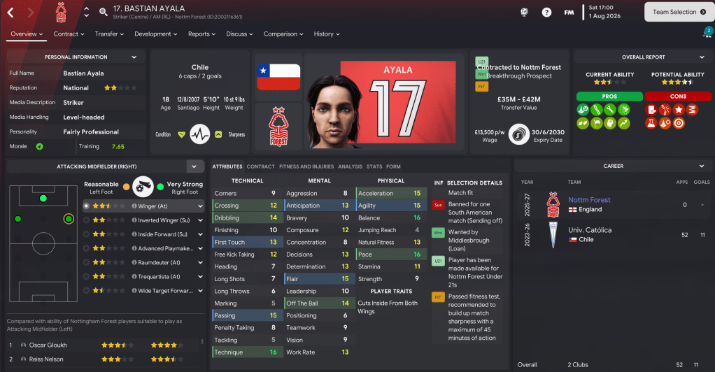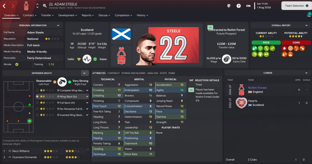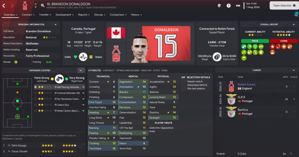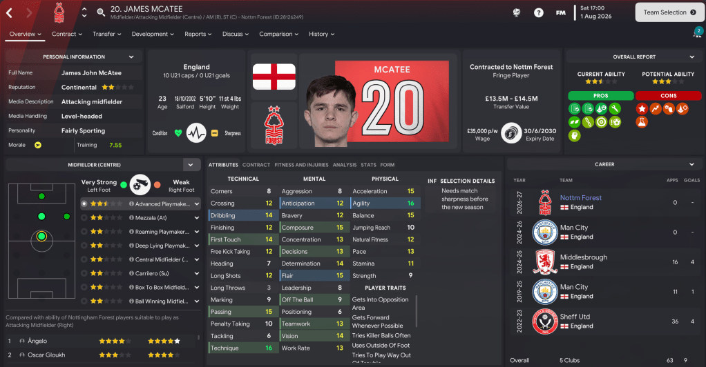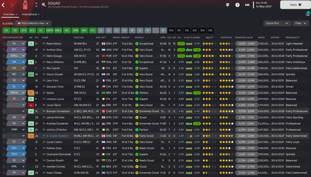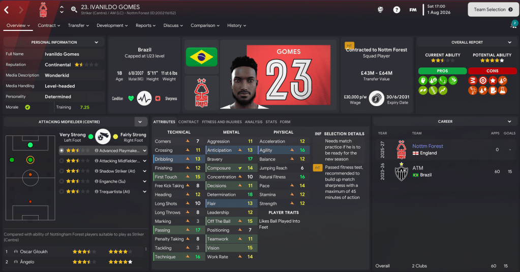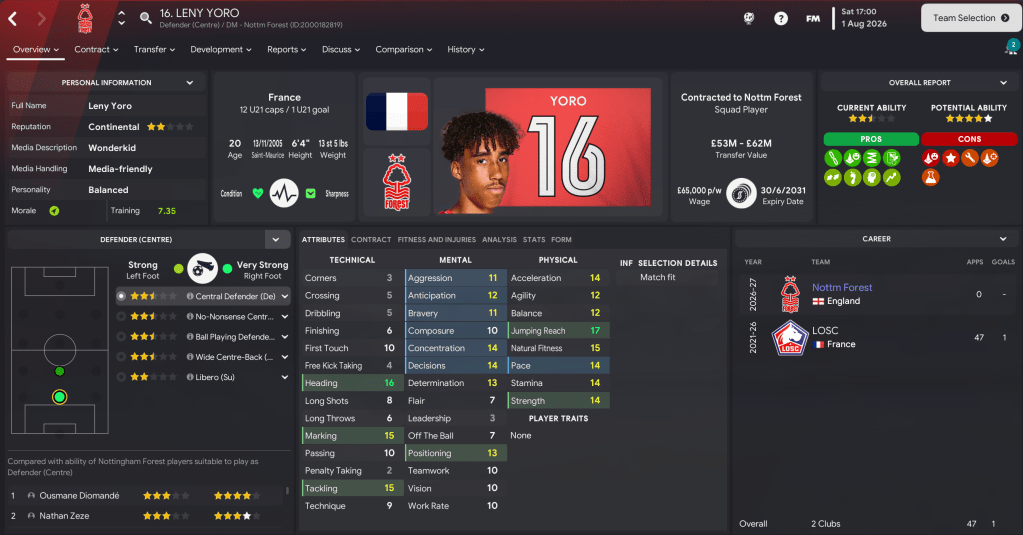 That left us with a transfer budget of around £100m. Our first signing was a Brazilian wonderkid in 18-year-old striker Ivanildo Gomes, who we’re going to train as a central midfielder given his 17 passing. But the big requirement was at centre-back so we signed 6ft 4in Lenny Yoro for £30m from Lille and Brandon Donaldson, who needs to retrain as a ball-playing defender, from Benfica for £17.5m. We also brought in wonderkid striker Amílcar Silva for £6.5m from Boca Juniors, a couple of promising Chileans in left-back Salvador Ortiz and attacker Bastian Ayala for £2m and £4m from Universidad Católica, and backup right-back Adam Steele for £10m from Hearts. And we snapped up Man City midfielder James McAtee on a free.