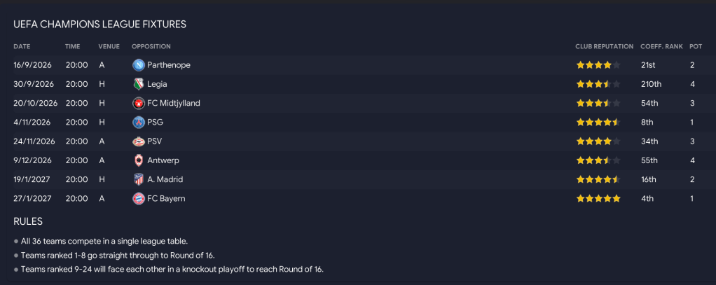 We started at Napoli and were a little unlucky to lose 3-2 to a Raspadori hat-trick, but rotated teams recorded back-to-back 3-0 wins over Legia and Midtjylland. We got ripped apart by Mbappé then lost 3-2 at PSV despite Amílcar’s brace but got a crucial win in Antwerp before two tough games after Christmas.