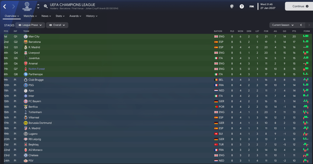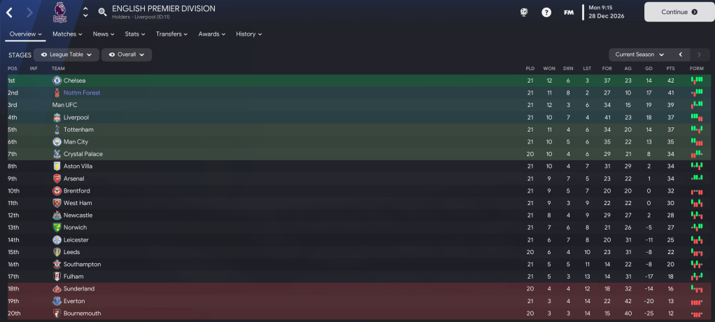 December began with a trip to 12th-place Arsenal led by newly-appointed Pep Guardiola and we held them to 0-0. But our shocking record against Liverpool continued with a 2-1 home loss, which takes us to just one win and 12 defeats in 14 meetings in this save. Late Amílcar and Nelson strikes saw us beat Brentford 2-1 and we repeated the feat three days later as Ângelo and Amílcar’s late goals earned a fantastic smash-and-grab 2-0 win at Man City. And that took us into 2027 in an impressive 2nd place, just one point behind Chelsea!