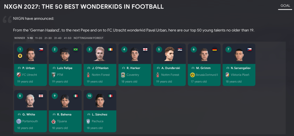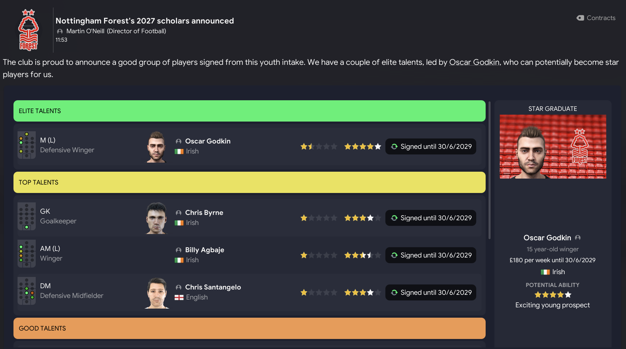 A good example of our potential was O’Hanlon’s emergence as a starter. He also csme 3rd in NxGn 2027 with his fellow attacker Dunderski in 5th. And he was joined at the club by 3 more countrymen in our latest youth intake led by full-back Oscar Godkin.