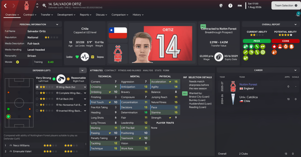 The summer activity left us with a bigger squad and a huge amount of potential. However, our plans were rocked by left-back Emanuele Valeri suffering damaged cruciate ligaments in a friendly, which ruled him out for up to 7 months. Ortiz will compete with Lucas Castro for the left-back spot but the rest of the starting 11 remains as it was last season. However, it has significantly better strength in depth supporting it with 11 players at the club having 5-star potential.