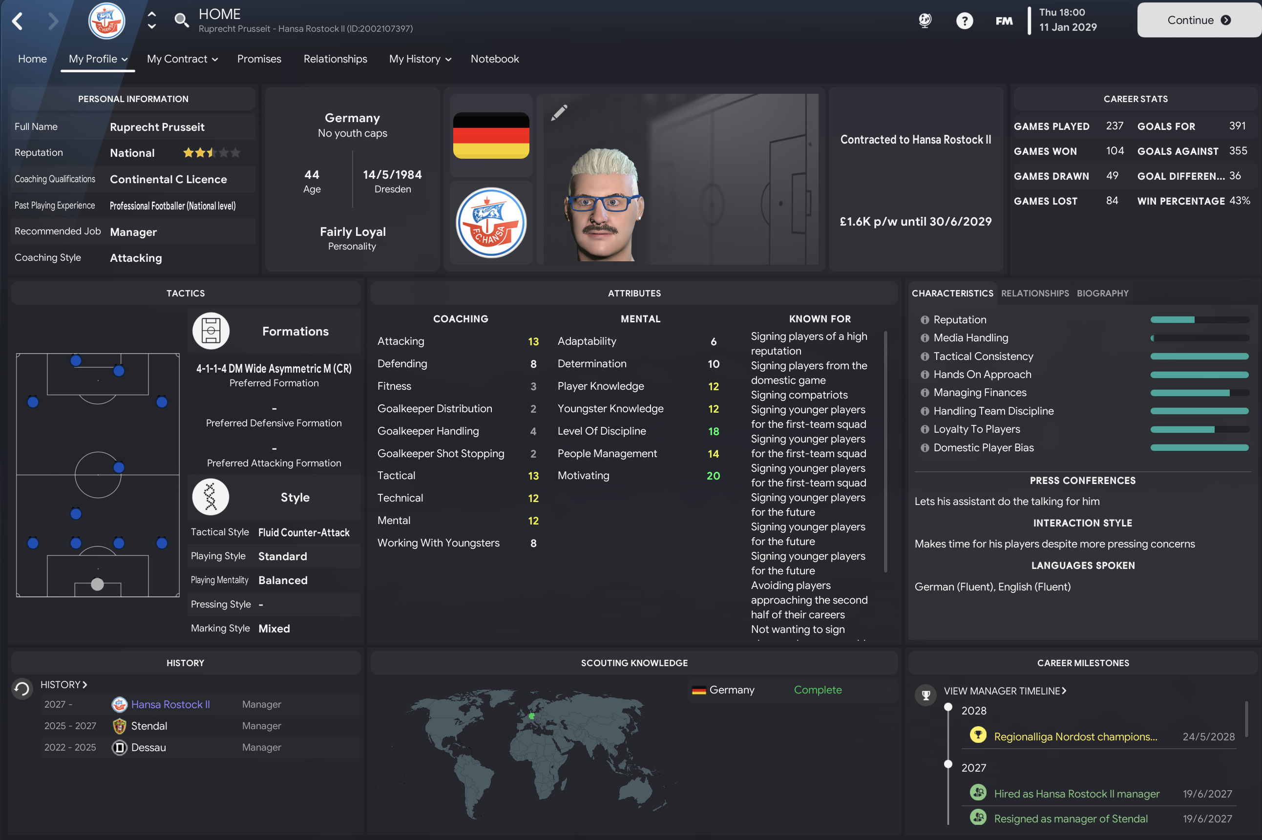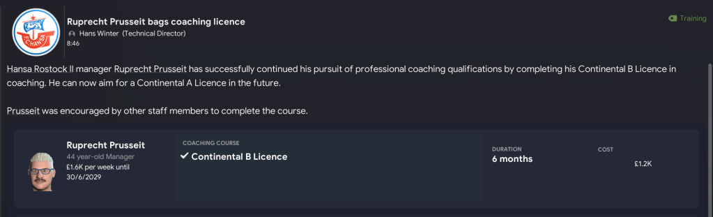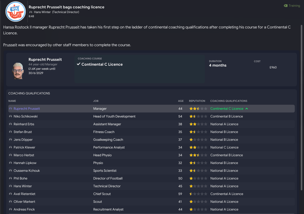 Having signed his first ‘professional’ contract this season, Prusseit took another vital step on his path to the top of German football by completing his Continental C Licence. As a result, his profile, reputation and coaching attributes had seen a marked improvement. Furthermore, the Rostock II board was so delighted with his contributions that they agreed to send him on his Continental B Licence coach a month later.