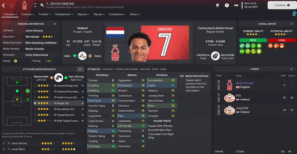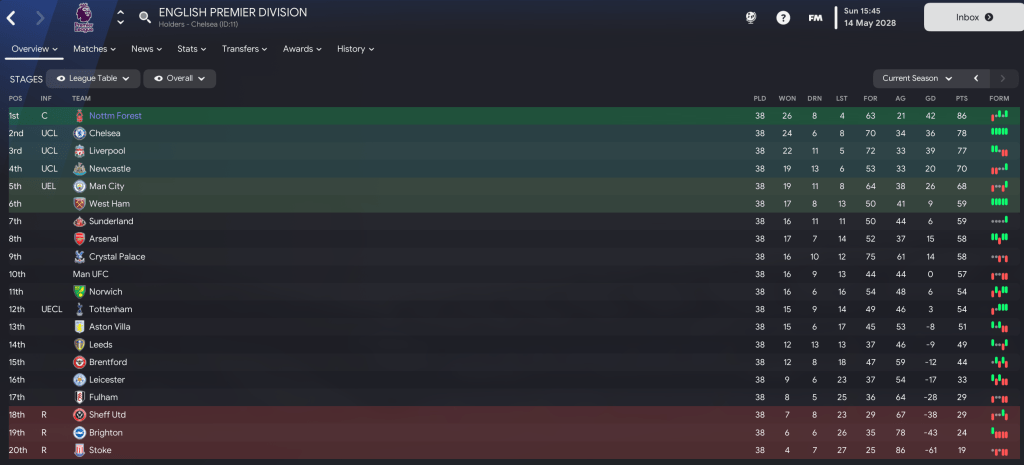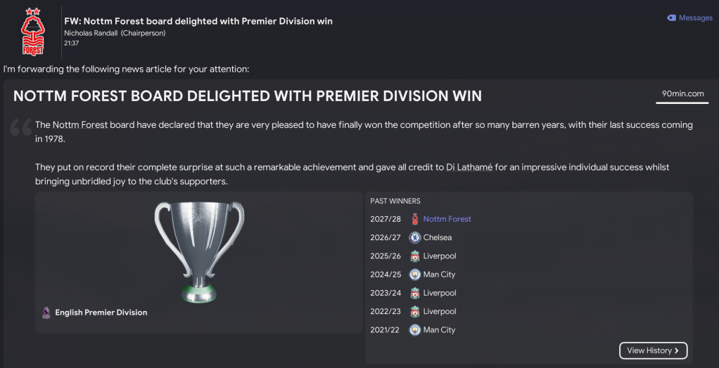 Last season’s exploits saw us begin the season with £220m in the bank, which saw the board agree to my requests to boost our training and youth facilities and youth recruitment then invest £17m into expanding the stadium capacity by around 4,000 seats to 34,739. In other news, our efforts in the Champions League saw Forest become the 18th-best team in Europe ahead of the likes of Juventus, Milan, Spurs and Newcastle.
