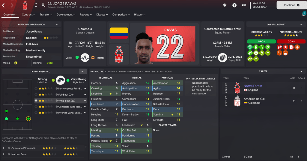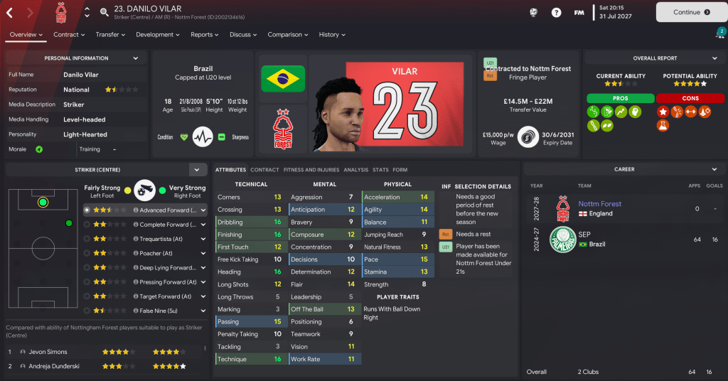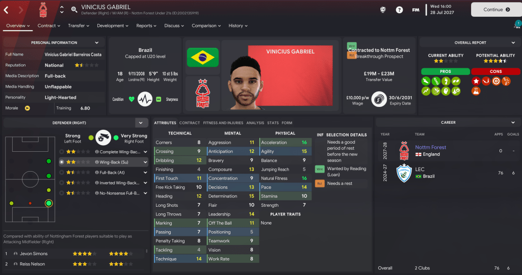 That gave us a transfer kitty of more than £160m to work with. The biggest outlay saw us achieve the rarity of beating Liverpool to a signing as we brought in winger Jevon Simons for a new club-record £42.5m rising to £68m. We also added a few more exciting full-backs in Jorge Pavas for £4.5m from América de Cali, Lassaad Kadri from Lorient for £7.5m and Vinicius Gabriel for just £130k from Londrina. We also took a bit of a gamble on 18-year-old Palmeiras striker Danilo Vilar, which I’m pretty sure will pay off.