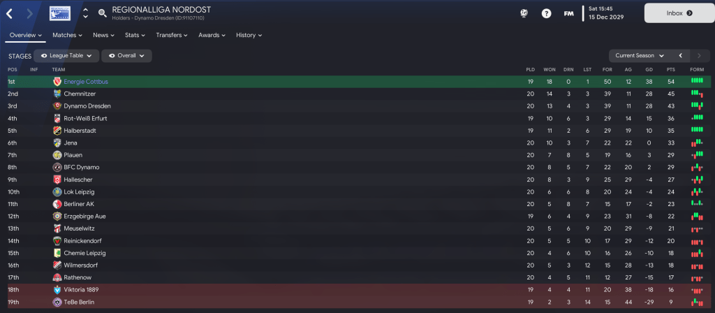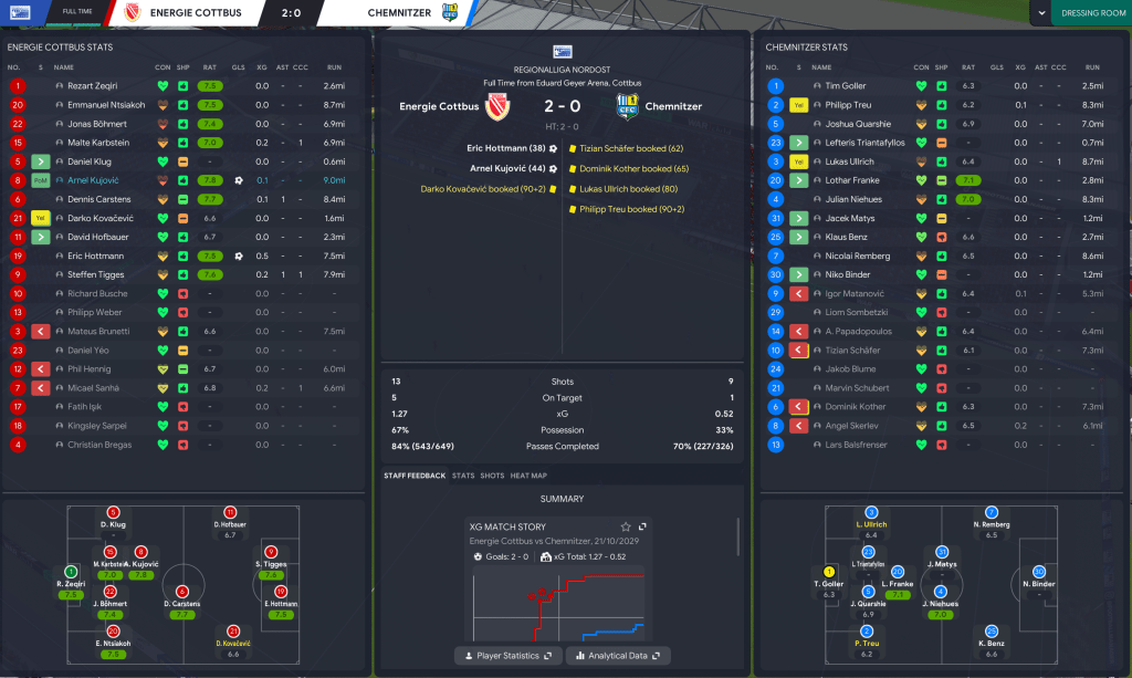 That took Cottbus into the winter break with an impressive nine-point lead over Chemnitzer and 11-point lead over Dresden with a game in hand. They’d still only dropped points once, scored a league-high 50 and conceded 12. Hottmann and Tigges lead the way with 15 goals each, Sanhá tops the assists with 12 and Tigges has the best average rating of 7.84 followed by Hottmann’s 7.73.